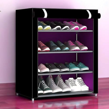 Shoe Rack|Non-Woven 4 Shelves Shelf|Foldable Storage Rack Organizer for Shoe, Books-Pack of 6 (Black)