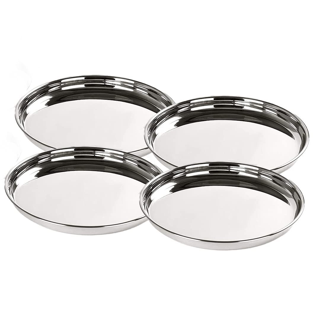 Set of 4 Stainless Steel Glossy Dining Plate Set | Blunt Edges Deep Base | Durable Easy to Clean | for Lunch Breakfast Dinner |