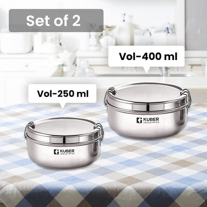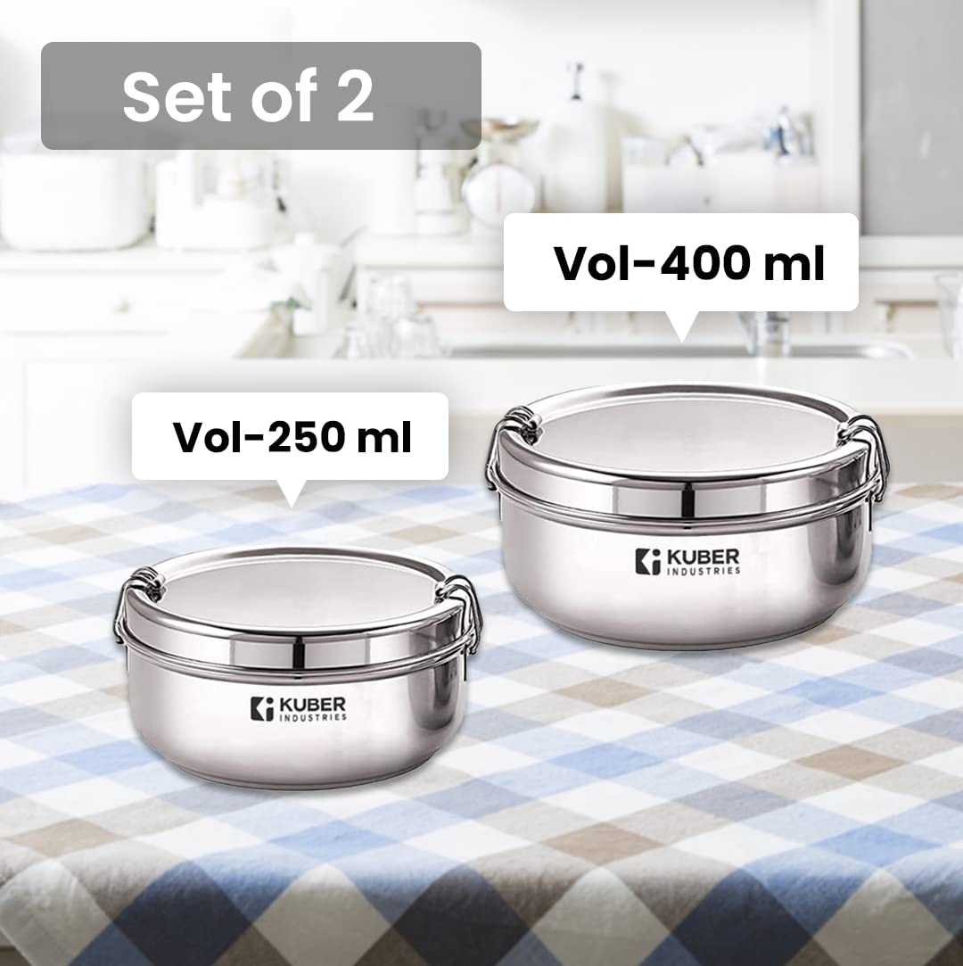Kuber Industries Stainless Steel Food Pack Lunch Box with Steel Separator Plate and Locking Clip, 2 Pc-250 and 400 ml Capacity