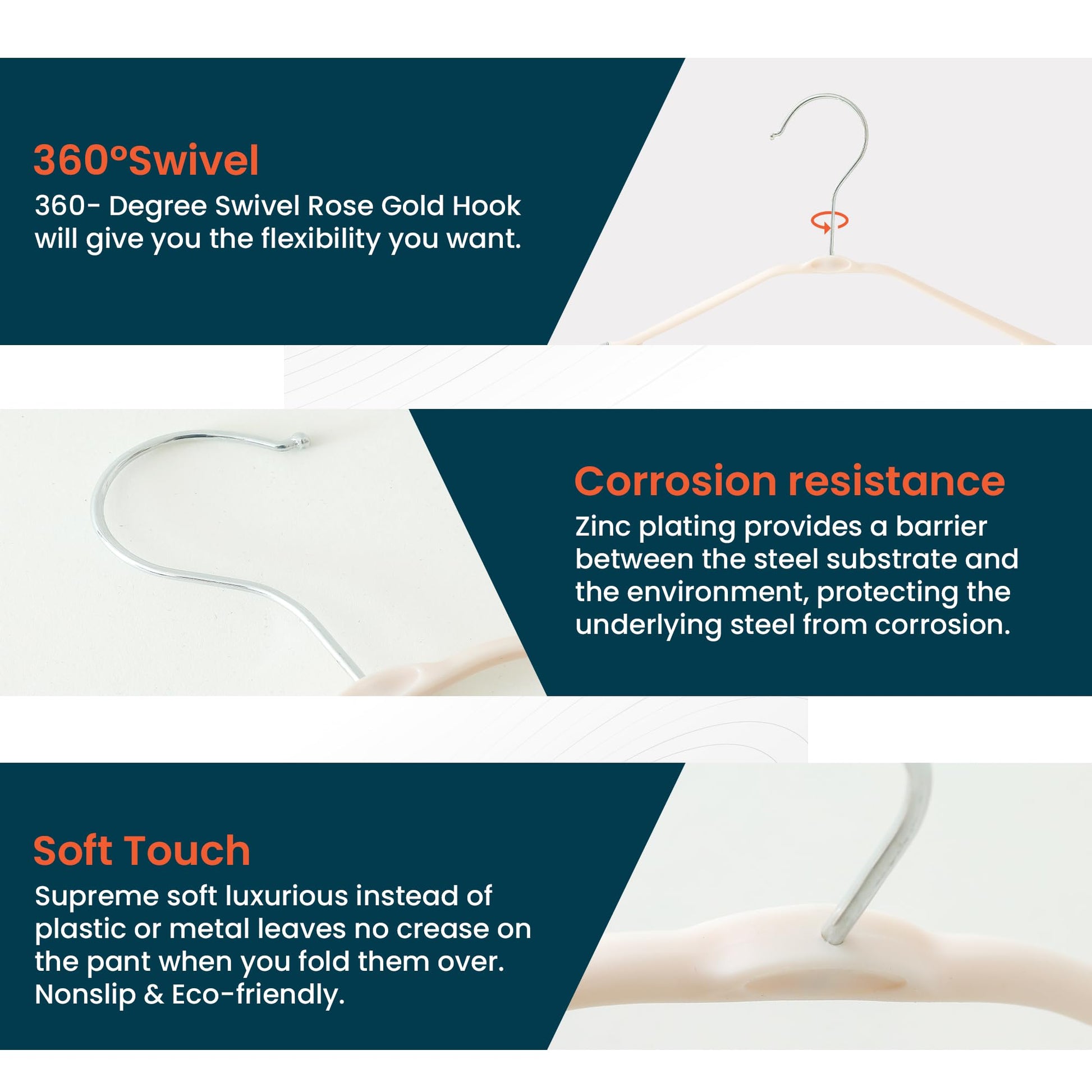 • Robust Zinc Plated Steel Hook: Each hanger features a sturdy zinc plated steel hook that securely holds your clothes. The smooth finish prevents snags, protecting your garments from damage.