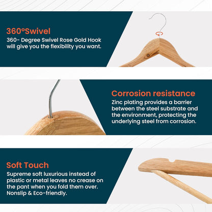 • High-Quality Material: Made from robust wooden material, these hangers exhibit exceptional strength and resilience, making them perfect for all your clothing needs.