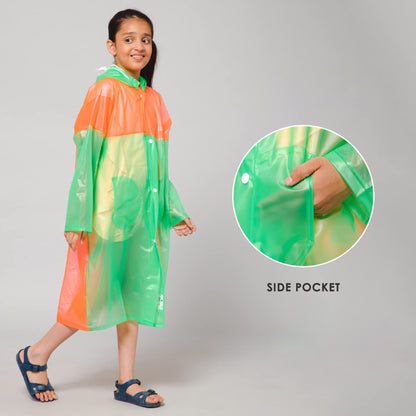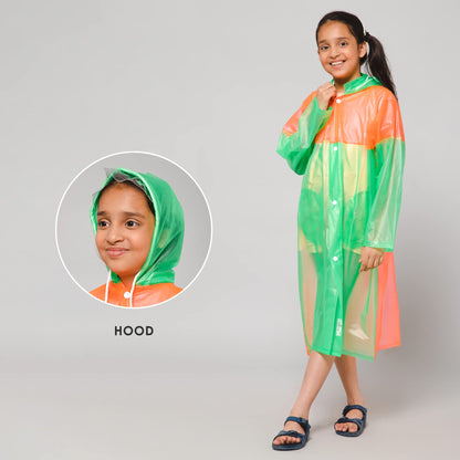 THE CLOWNFISH Puddle Jumper Series Unisex Kids Waterproof Single Layer PVC Longcoat/Raincoat with Adjustable Hood. Age-6-7 Years (Fluoroscent Green)