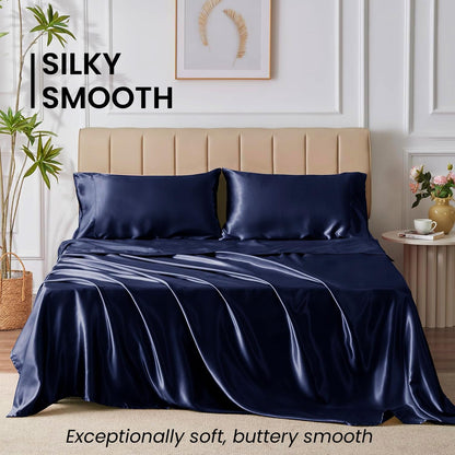 • EASY CARE: Enjoy wrinkle-resistant, machine washable satin bedsheets that maintain vibrant navy color and softness effortlessly.