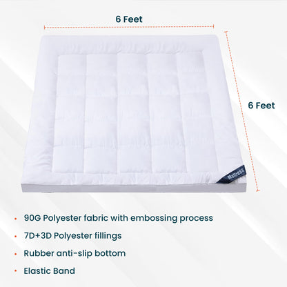 Introducing the Mattress Topper/Padding by Kuber International, your ultimate solution for a cozy and restful night's sleep. Designed for standard mattresses, this luxurious 6 x 6 Feet topper is crafted from high-quality 90G Polyester fabric with an embossing process. It promises a sublime sleeping experience with generous fillings of 7D+3D Polyester, ensuring a soft and plush feel, perfect for enhancing your overall comfort.