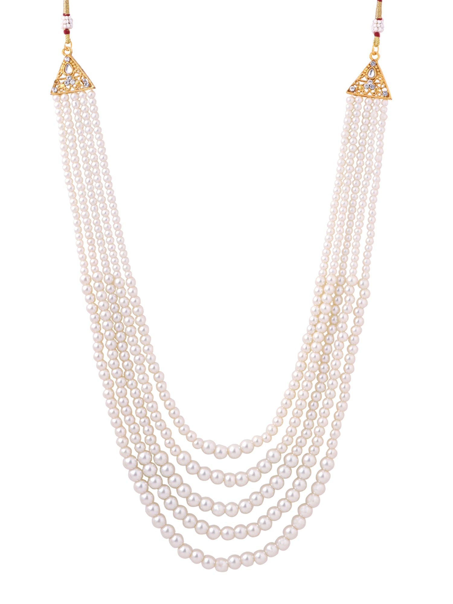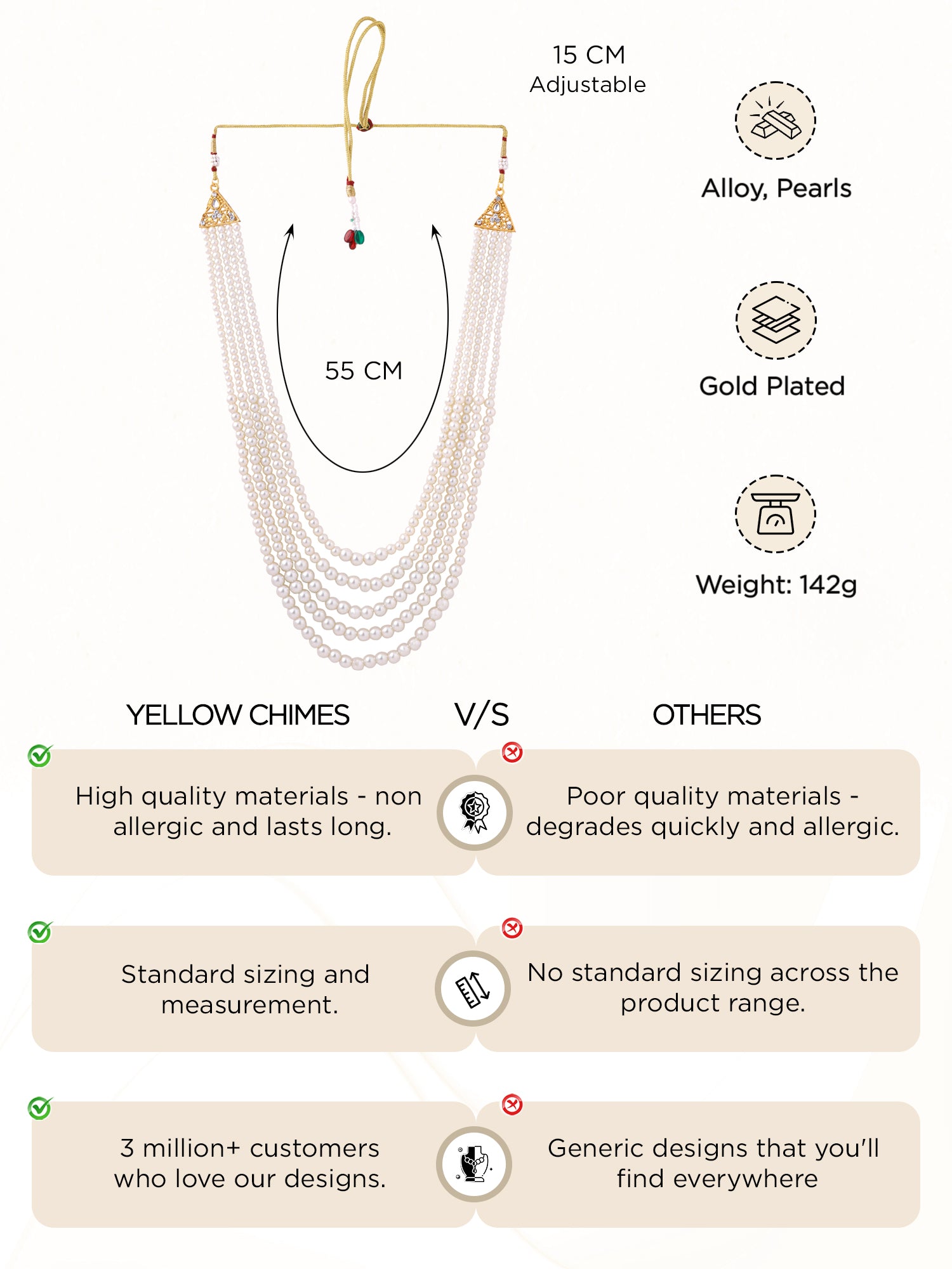 Introducing the Dulahmala for Men by Yellow Chimes, a stunning maharaja-style pearl necklace that enhances any special attire. This exquisite necklace features white beads and pearls, making it the perfect accessory for grooms. With an adjustable length of 55 CM, it's designed to suit various styles and fits. Ideal for any festive occasion, this mala haar transforms your look effortlessly.