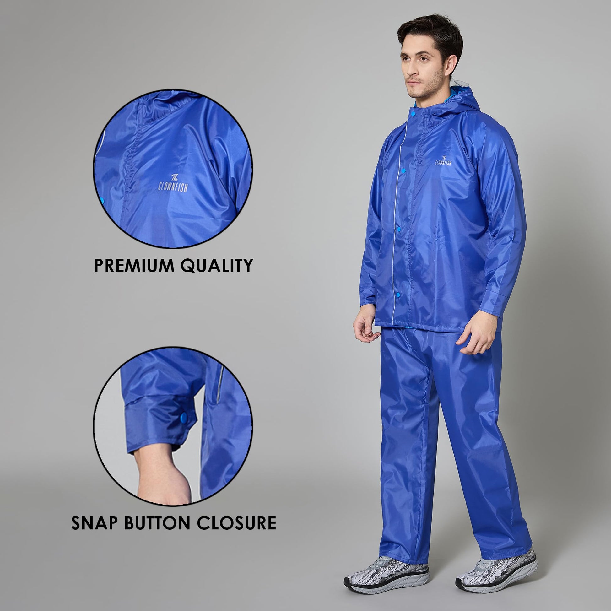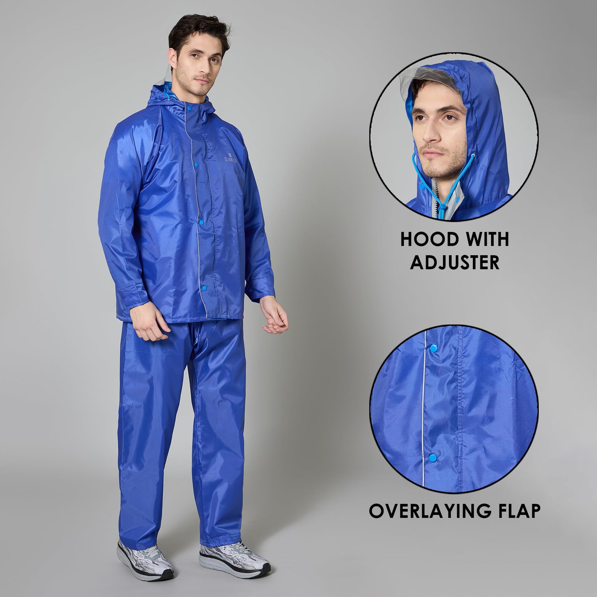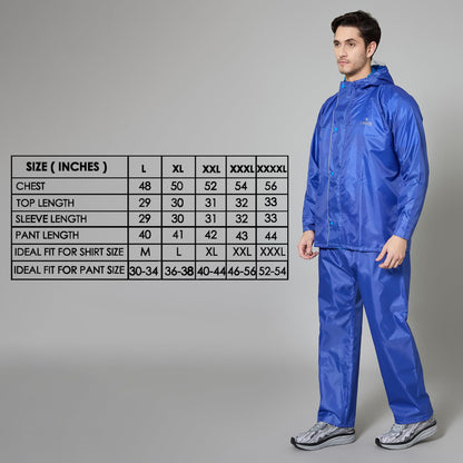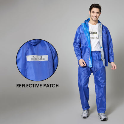 THE CLOWNFISH Rain Coat For Men Waterproof Raincoat With Pants Polyester Reversible Double Layer Standard Length Rain Coat For Men Bike Rain Suit Inner Mobile Pocket With Storage Bag(Royal Blue)Large