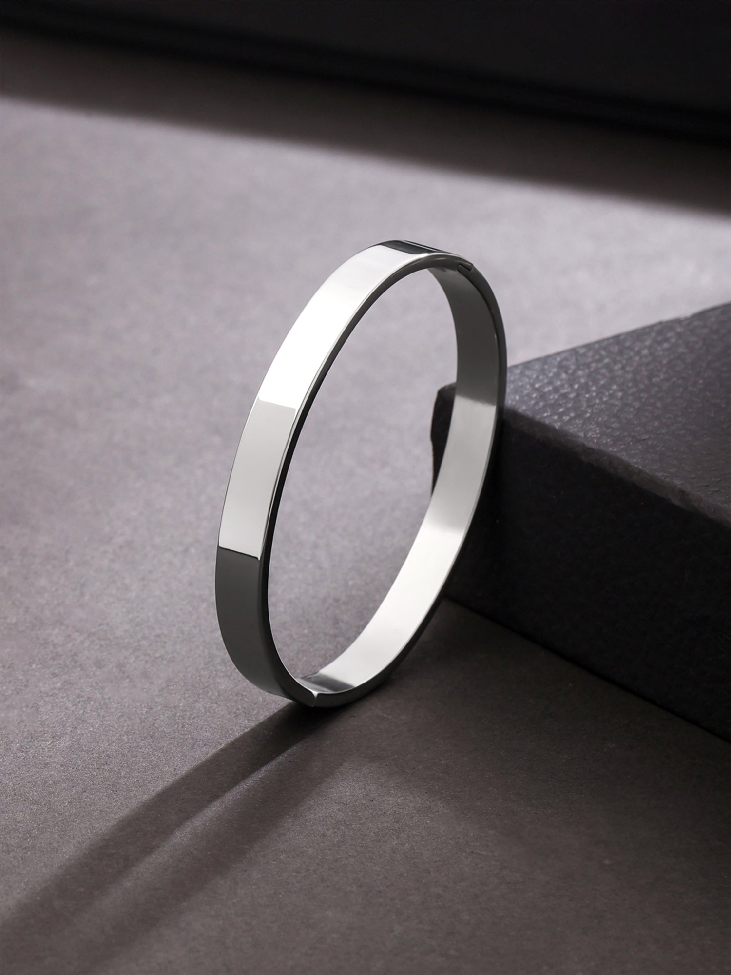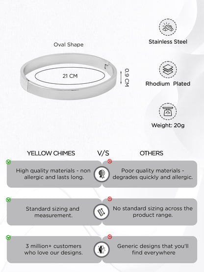 Introducing the High Polished Stainless Steel Stylish Silver Kadaa Bracelet by Yellow Chimes, your ultimate accessory for any occasion. This singular piece combines classical design with modern versatility, making it a must-have addition to your jewelry collection. The bracelet features a comfort fit with a diameter of 2.6 inches and a length of 2.2 inches, crafted from premium stainless steel. Its polished surface adds a touch of sophistication, suitable for men and boys alike.
