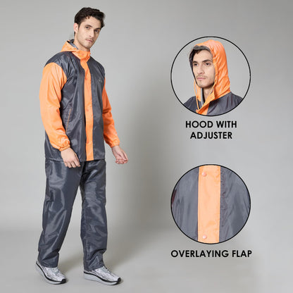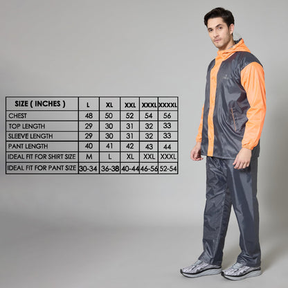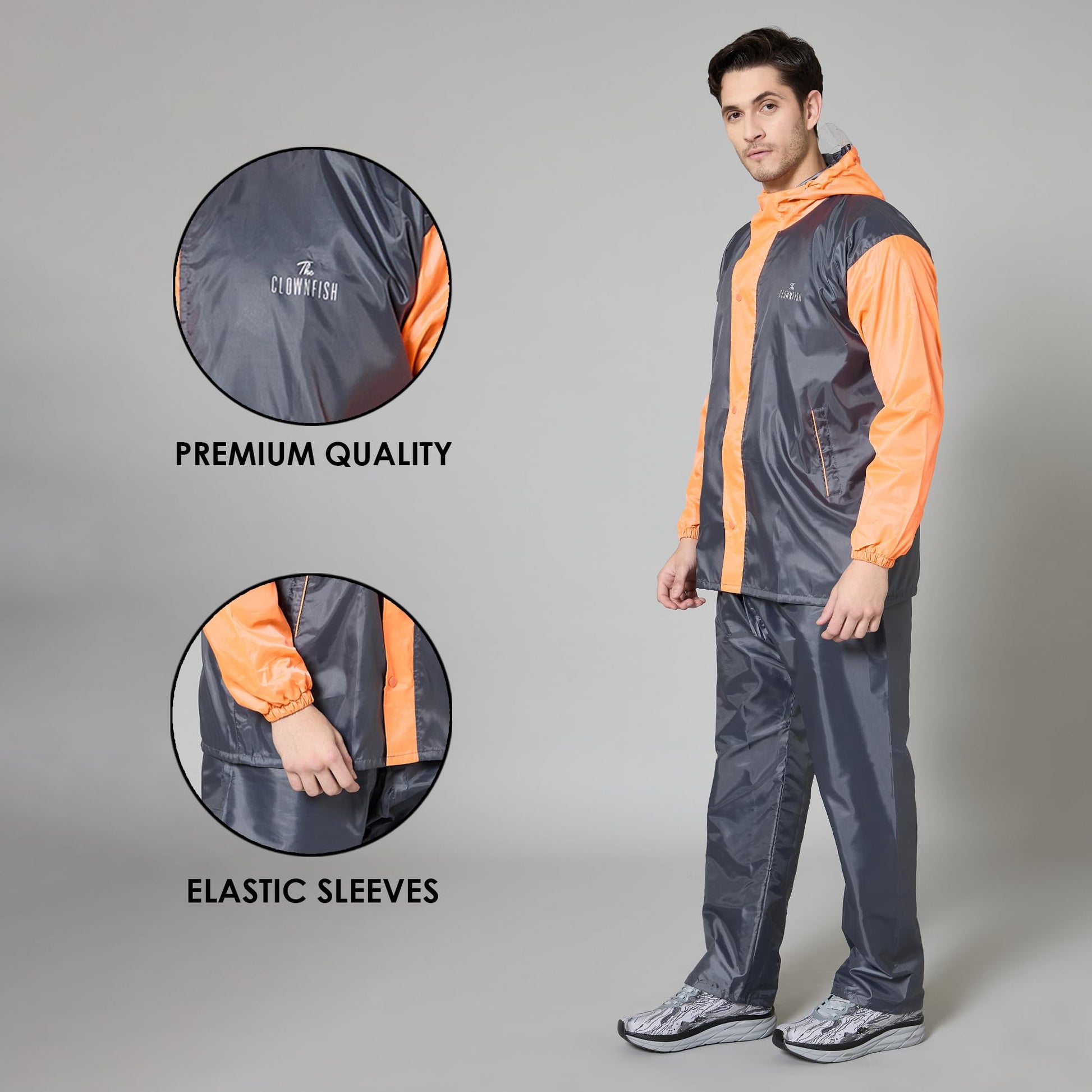 THE CLOWNFISH Raincoats for Men Waterproof Reversible for Bike Double Layer with Hood Rain Coat for Men. Set of Top and Bottom. Color Block Series (Grey/Orange, L)