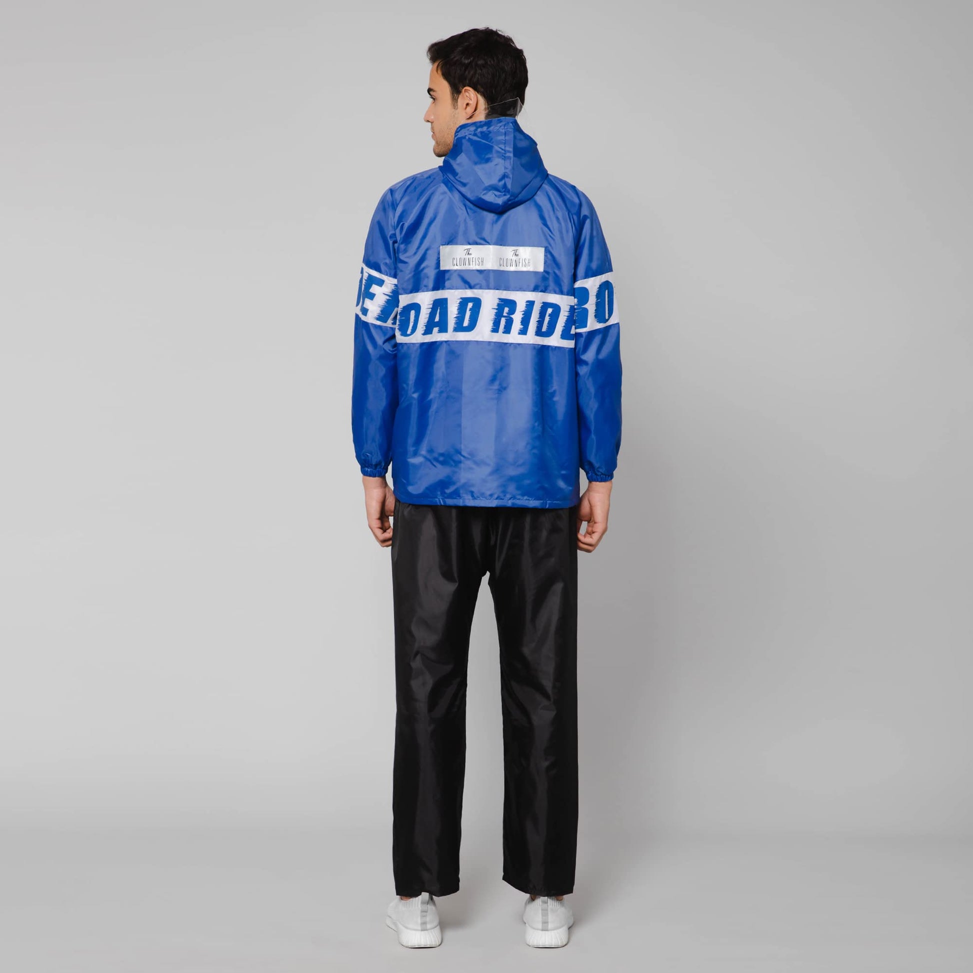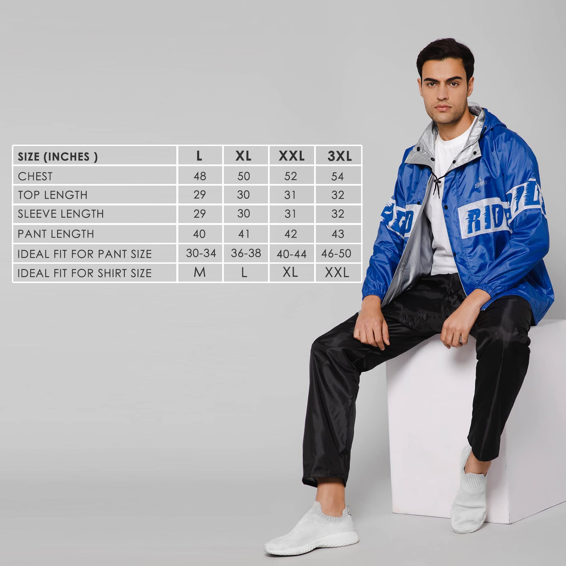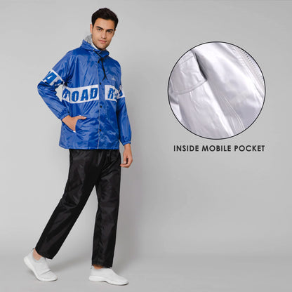 THE CLOWNFISH Road Rider Men's Waterproof Raincoat Polyester Double Coating Reversible Rain Suit with Hood & Inner Mobile Pocket. Set of Top and Bottom. Printed Plastic Pouch (Royal Blue, X-Large)