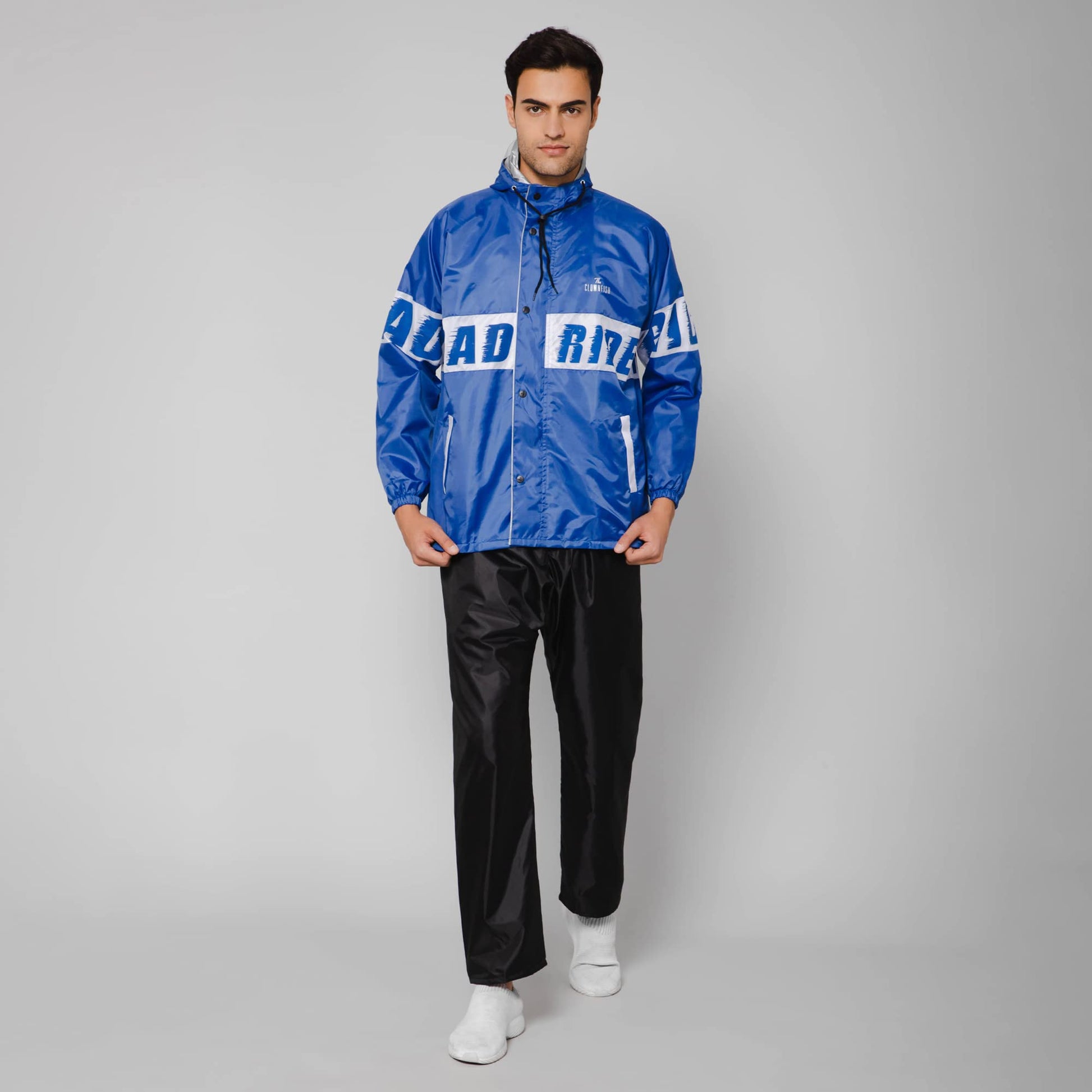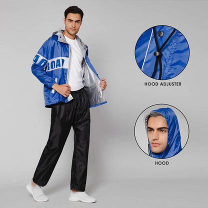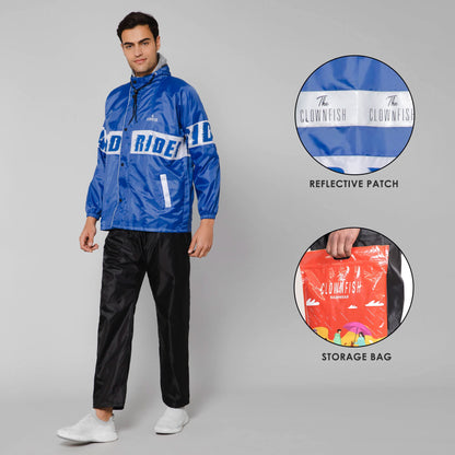 THE CLOWNFISH Road Rider Men's Waterproof Raincoat Polyester Double Coating Reversible Rain Suit with Hood & Inner Mobile Pocket. Set of Top and Bottom. Printed Plastic Pouch (Royal Blue, XX-Large)