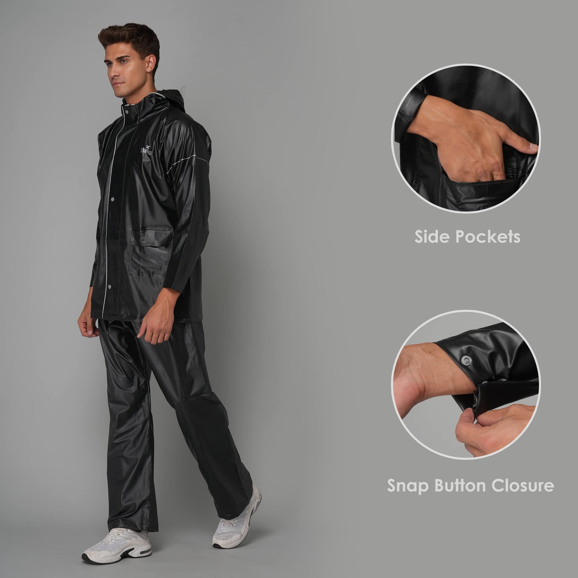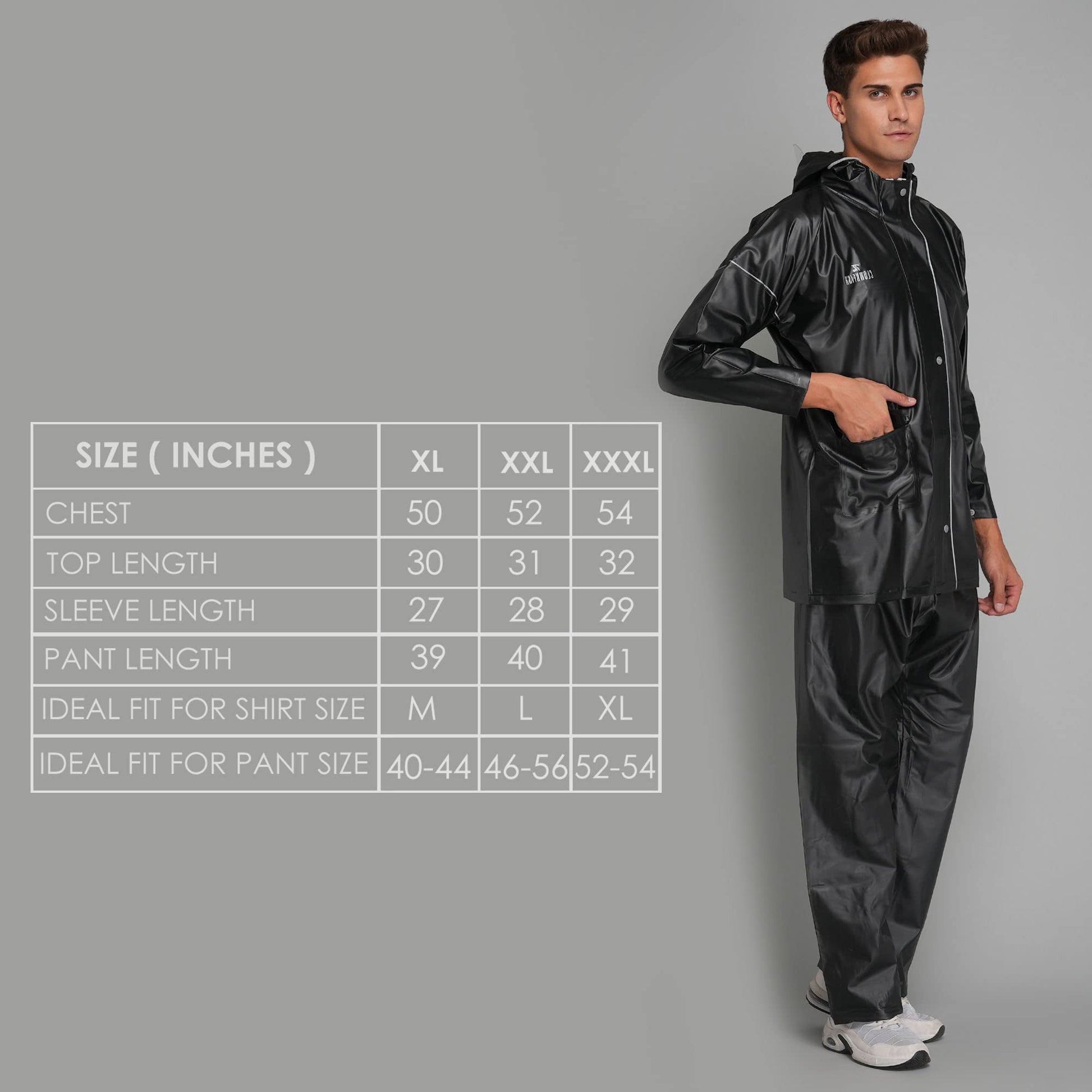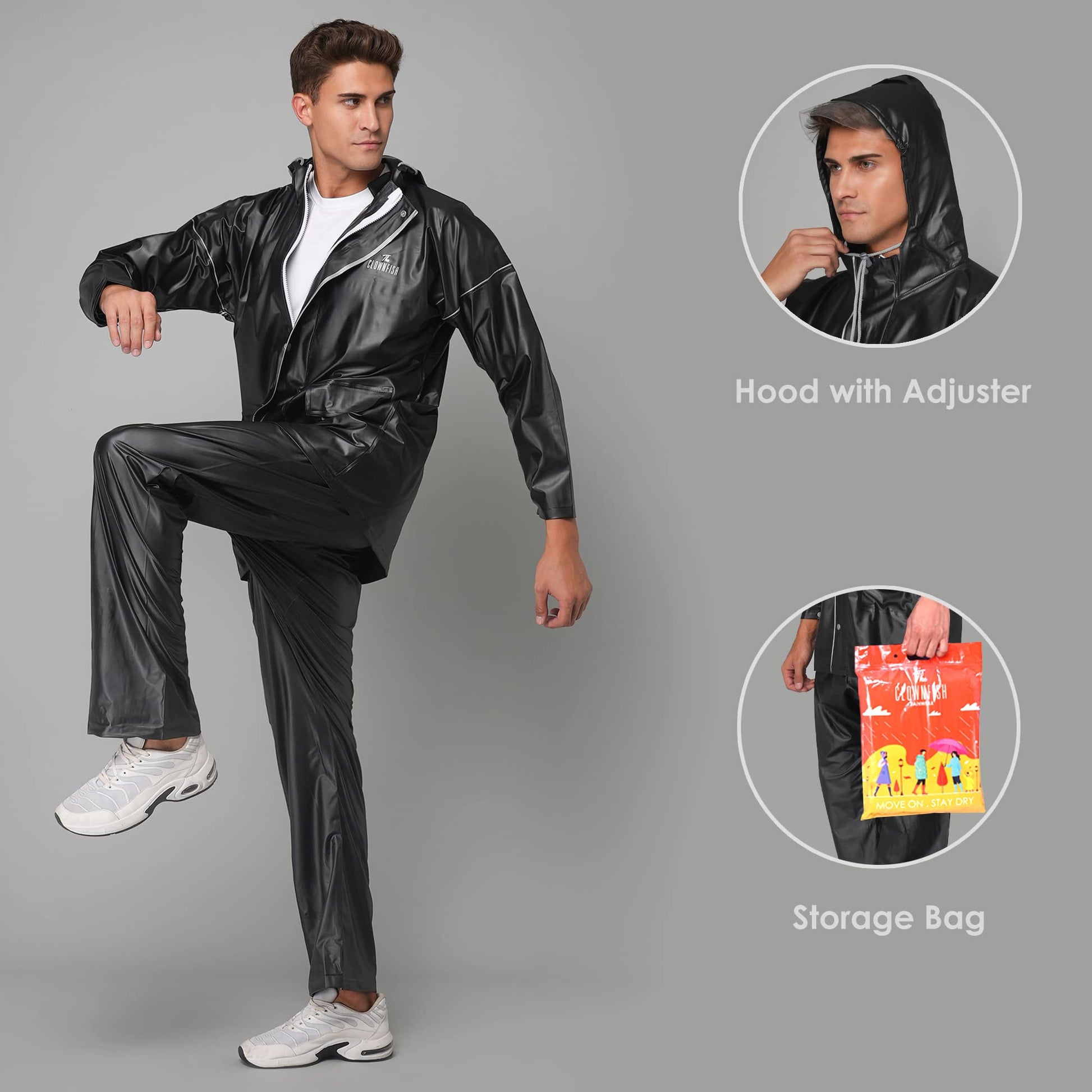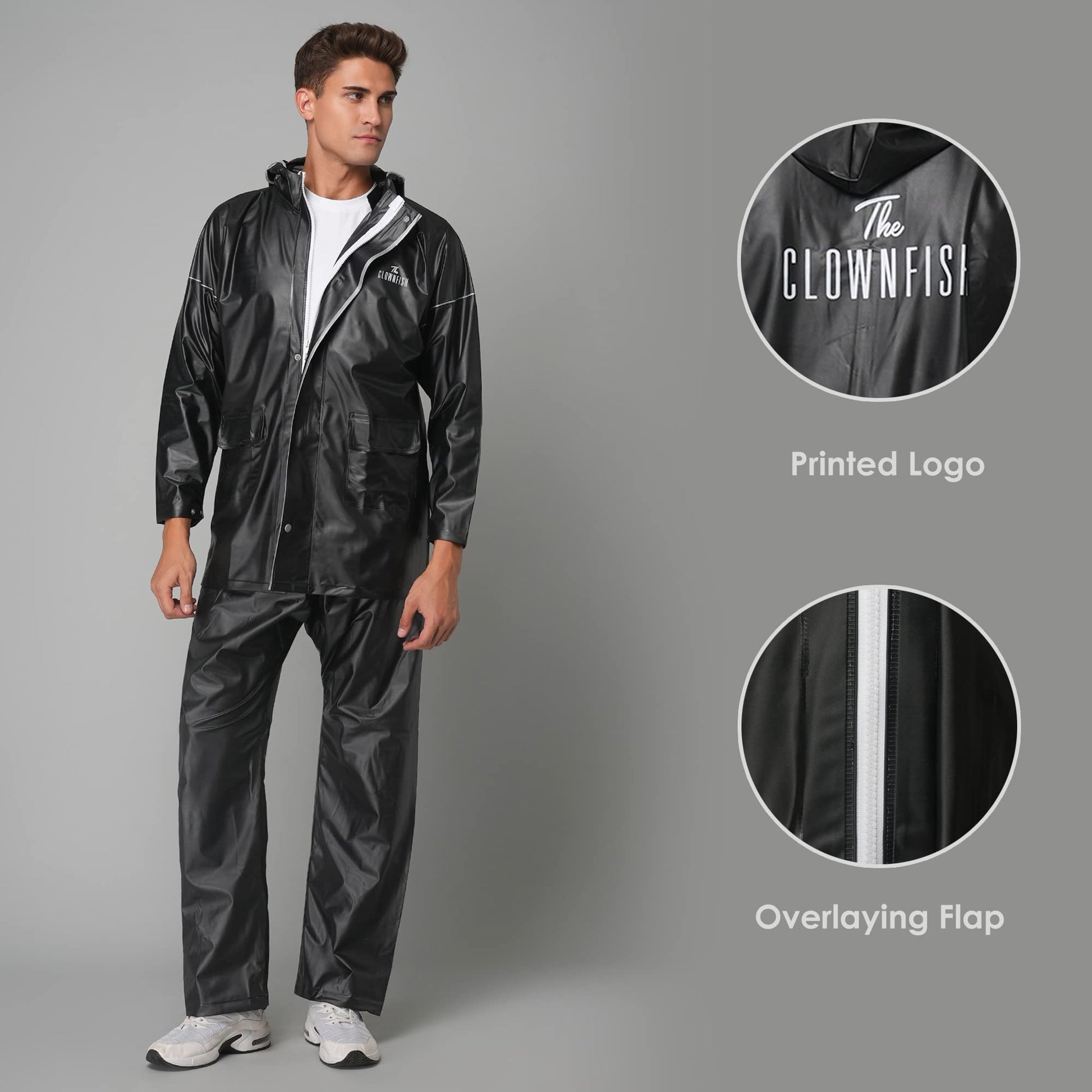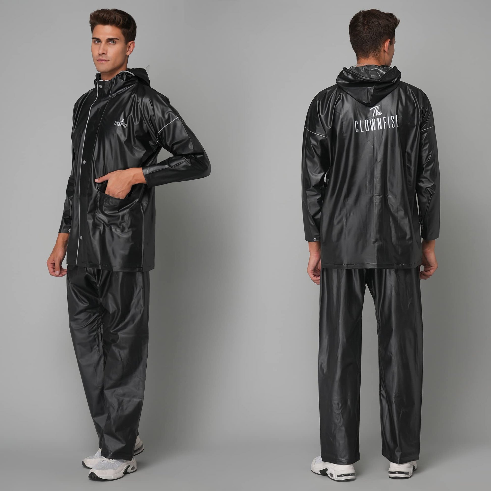 THE CLOWNFISH Oceanic Pro Series Men's Waterproof PVC Raincoat with Hood and Reflector Logo at Back for Night Travelling. Set of Top and Bottom (Black, XL)