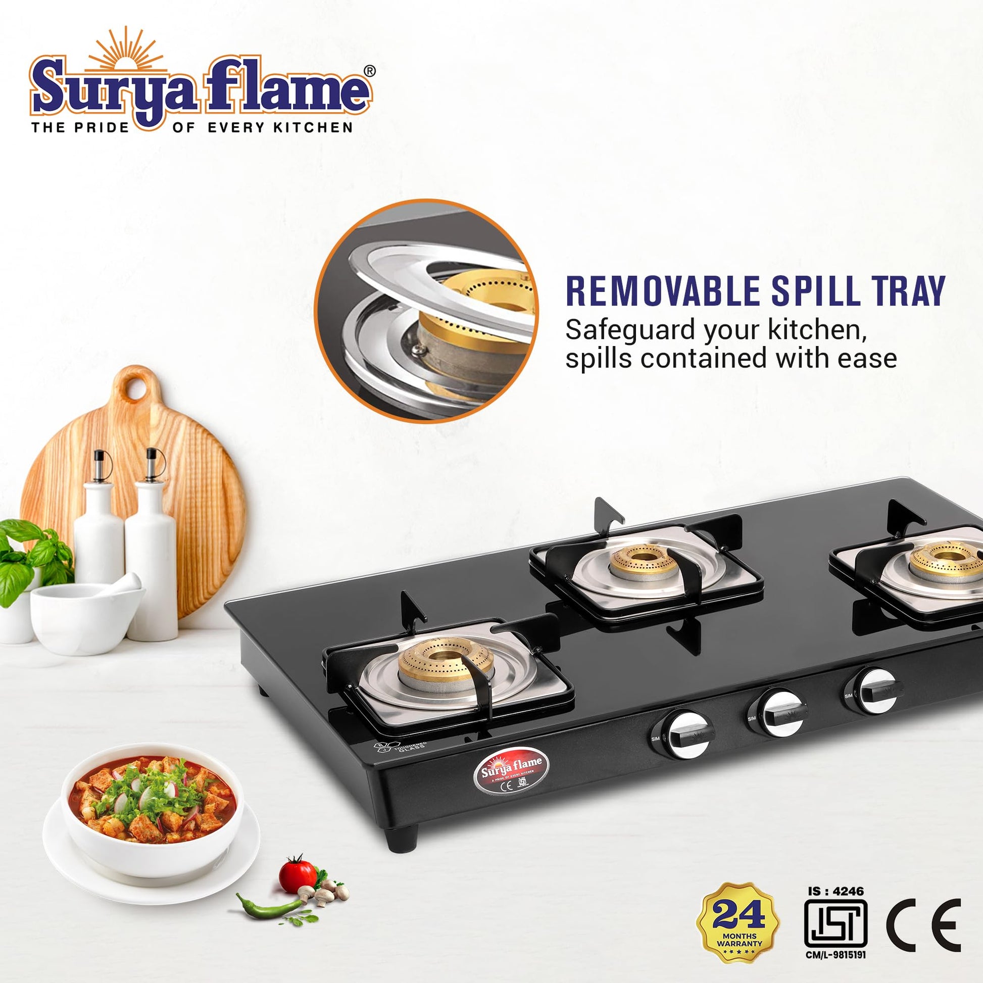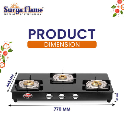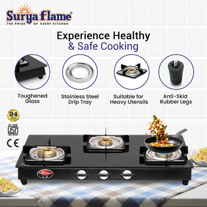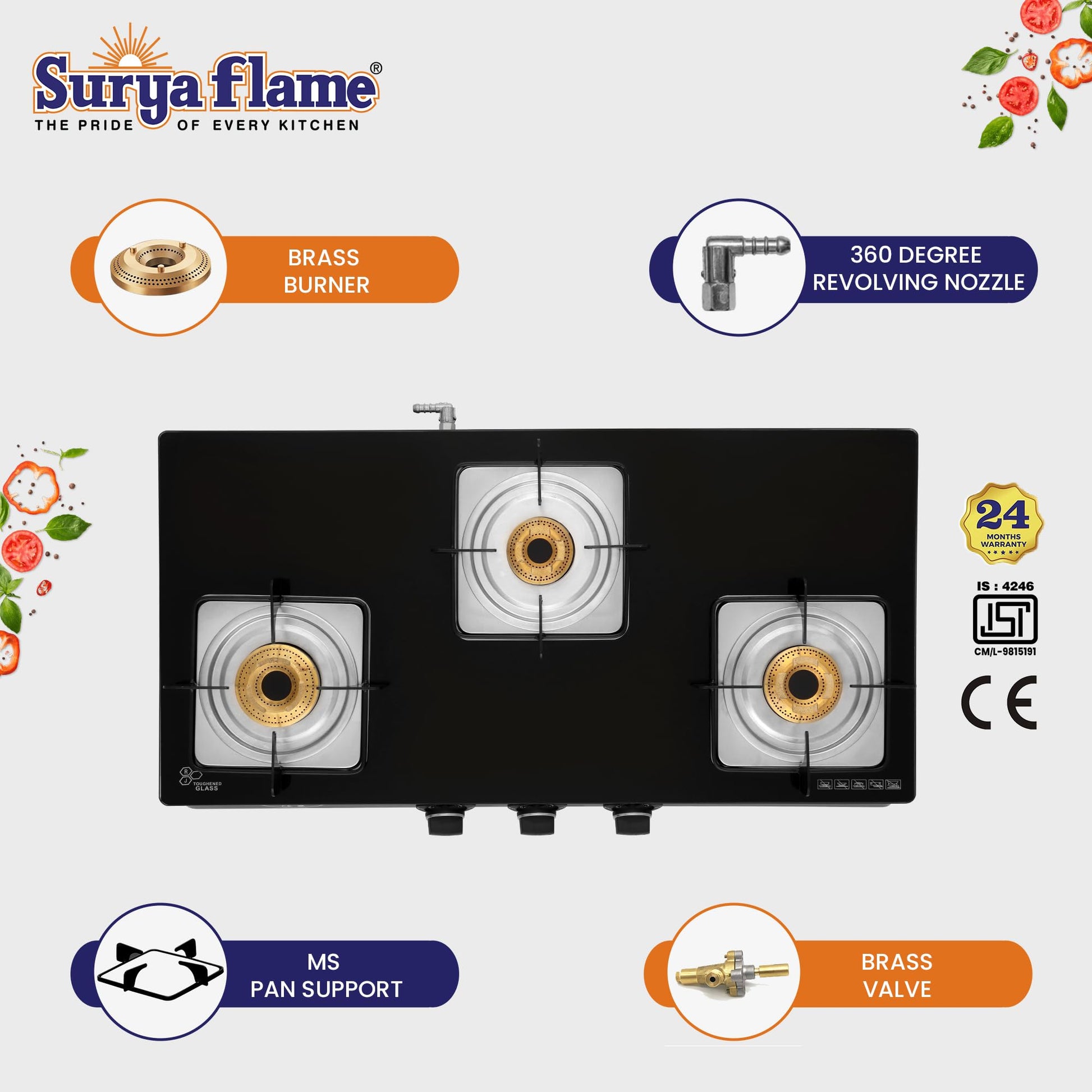 Introducing the Nexa 3 Burner LPG Gas Stove by Surya Flame, a perfect companion for your kitchen. This manual gas stove features a stylish black glass top with a durable powder-coated mild steel body and comes with a set of 2 brass burners including one medium and one small burner. Enjoy cooking with reliable performance supported by a 2 years complete doorstep warranty, ensuring worry-free usage.
