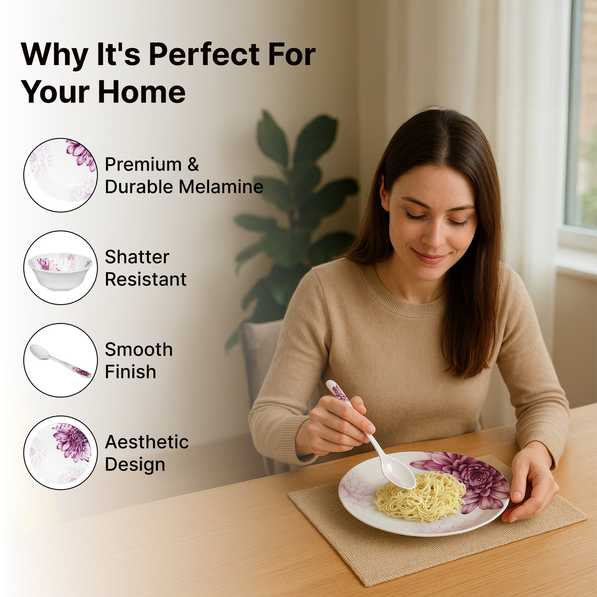 • COMPLETE DINING SET: 12-piece melamine set with beautiful purple floral patterns, perfect for serving 4 guests at any meal.