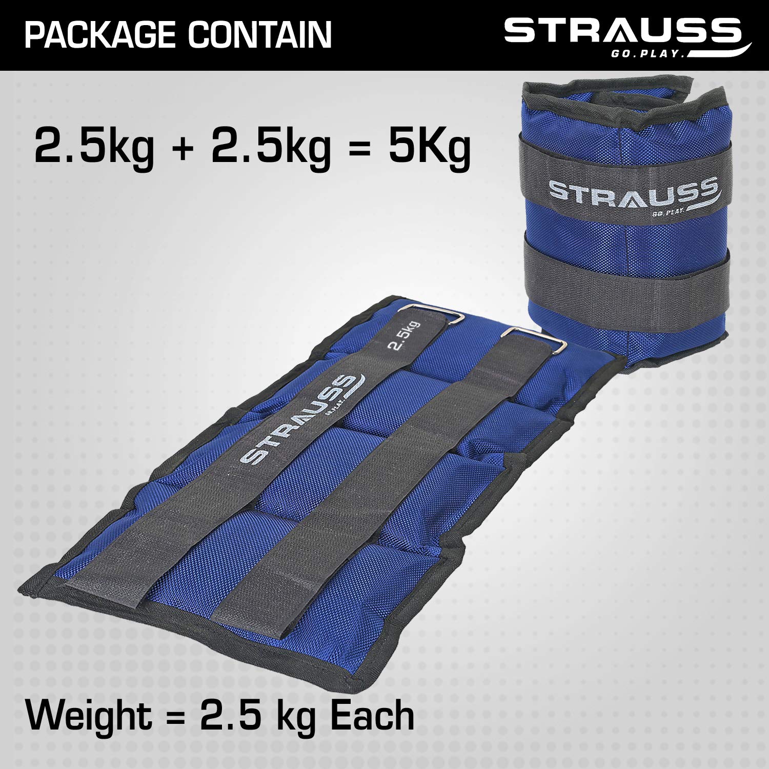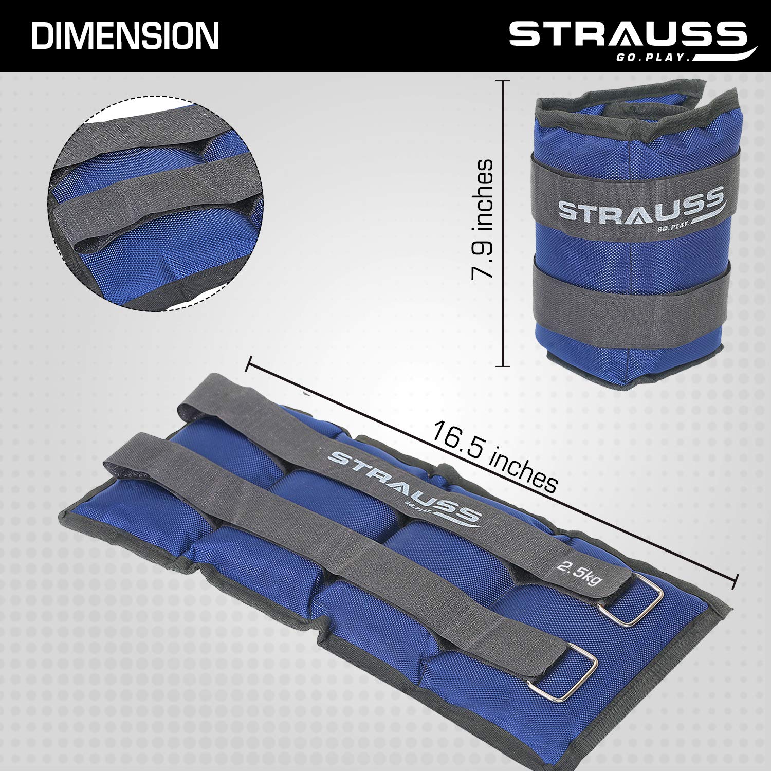 Strauss Adjustable Ankle/Wrist Weights 2.5 KG X 2 | Ideal for Walking, Running, Jogging, Cycling, Gym, Workout & Strength Training | Easy to Use on Ankle, Wrist, Leg, (Blue)