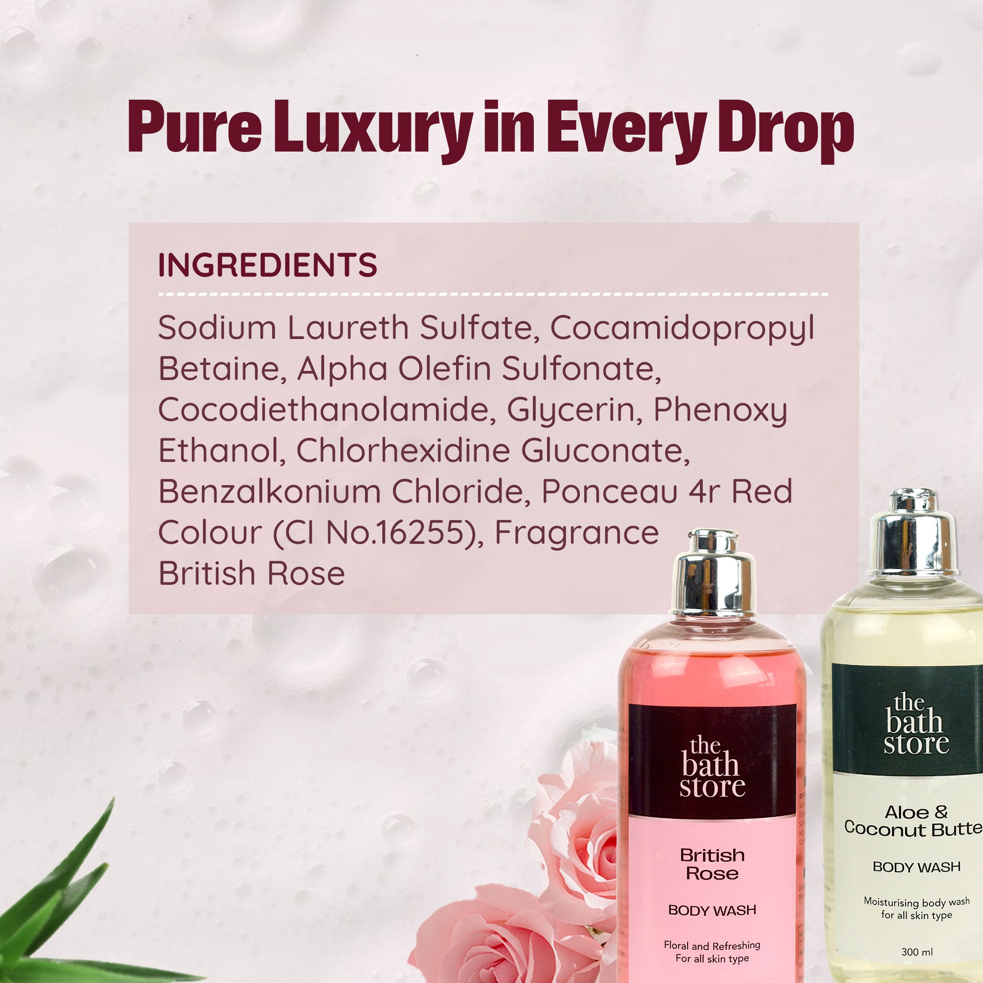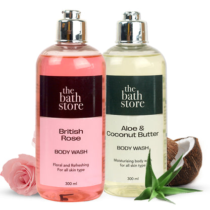 Pack of 2: Body Wash Shower Gel - Moisturizing, Tan Removal | Aloe & Coconut Butter + British Rose | 300 ml each | Fresh Scent