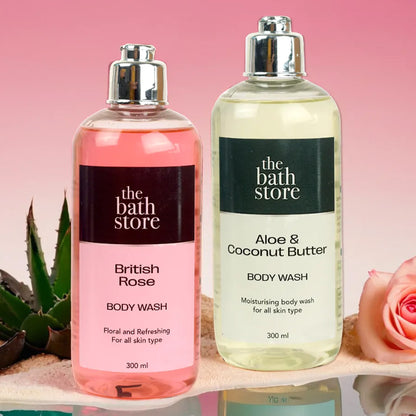 Introducing the The Bath Store Body Wash Shower Gel Pack of 2 by The Bath Store. This exquisite collection features two 300 ml body wash gels infused with soothing Aloe & Coconut Butter and aromatic British Rose. Perfect for daily use, this pack is designed for the whole family, ensuring that both dry and oily skin types are catered to with no compromise on cleanliness.