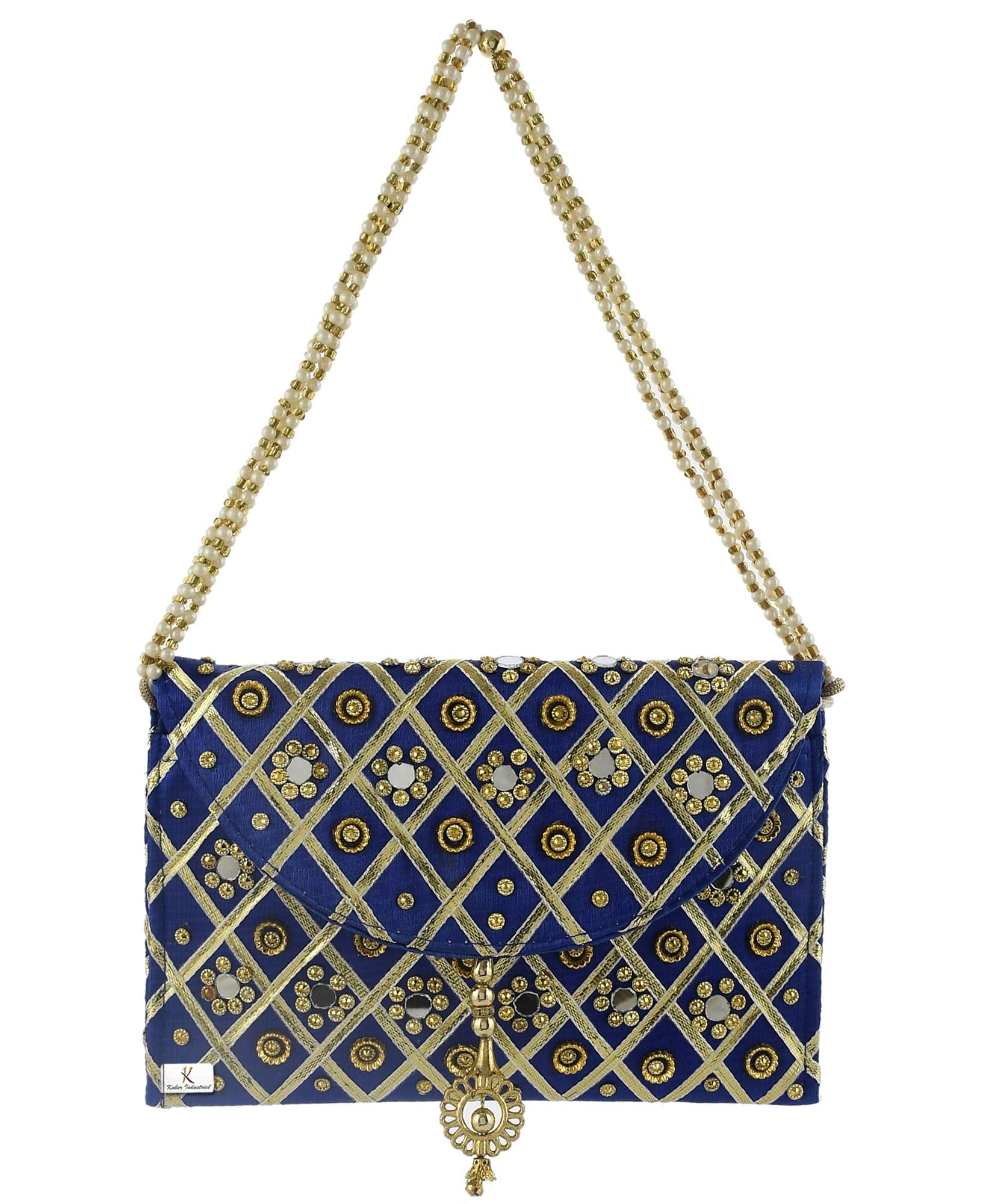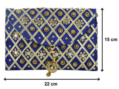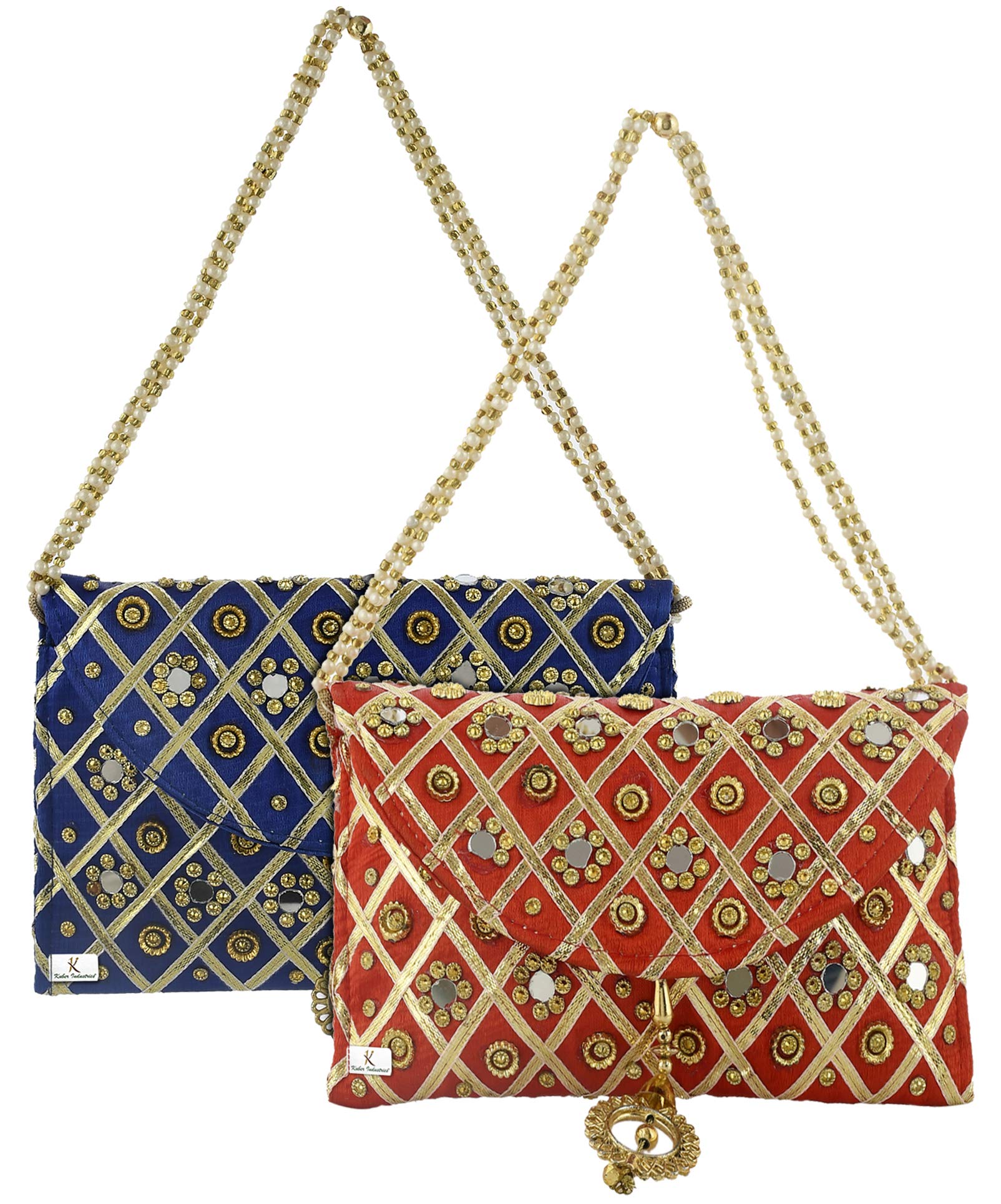 2 Pieces Silk Traditional Mirror Work Envelope Clutch/Hand Purse Bag for Women/Girls (Blue & Red)-KUBMART11467