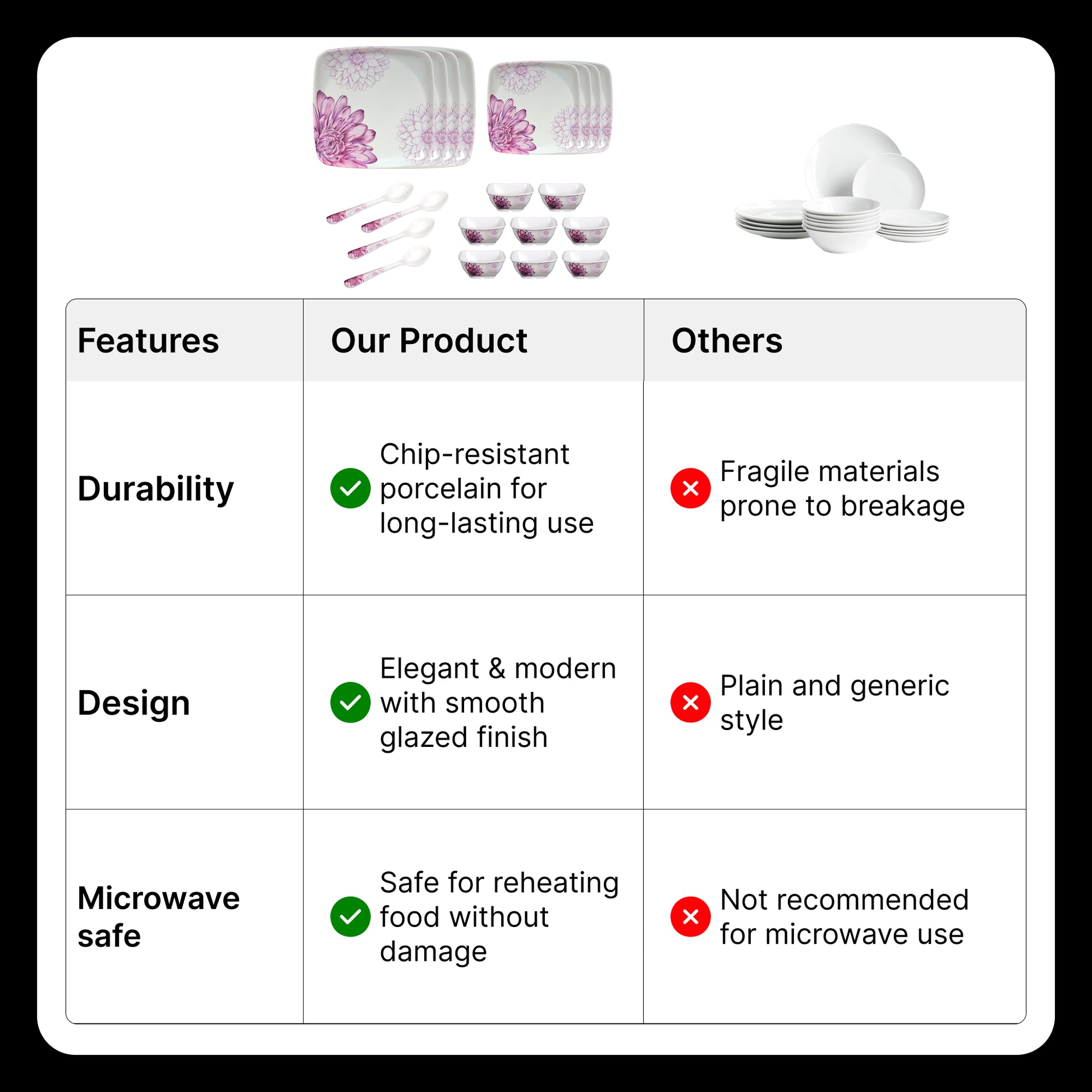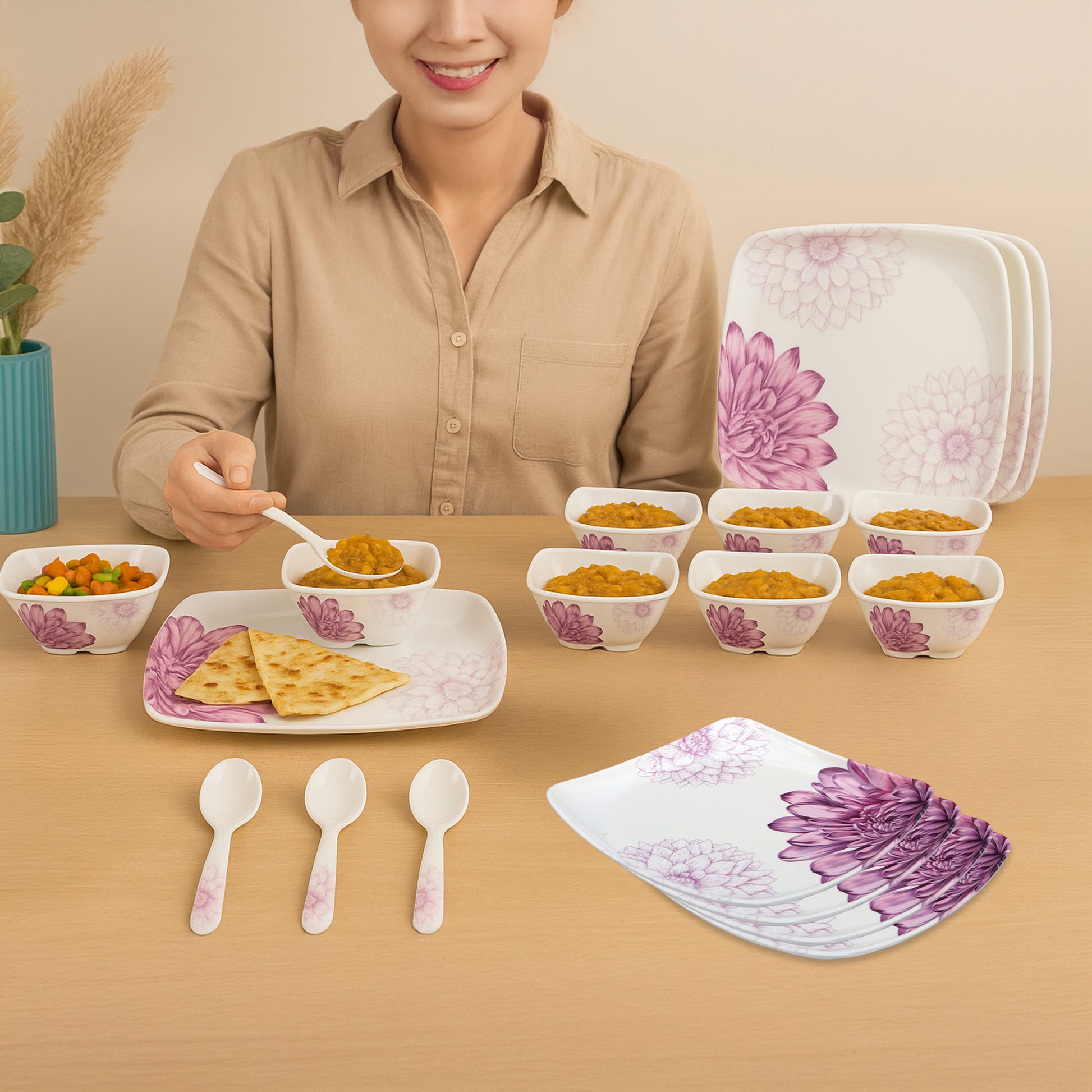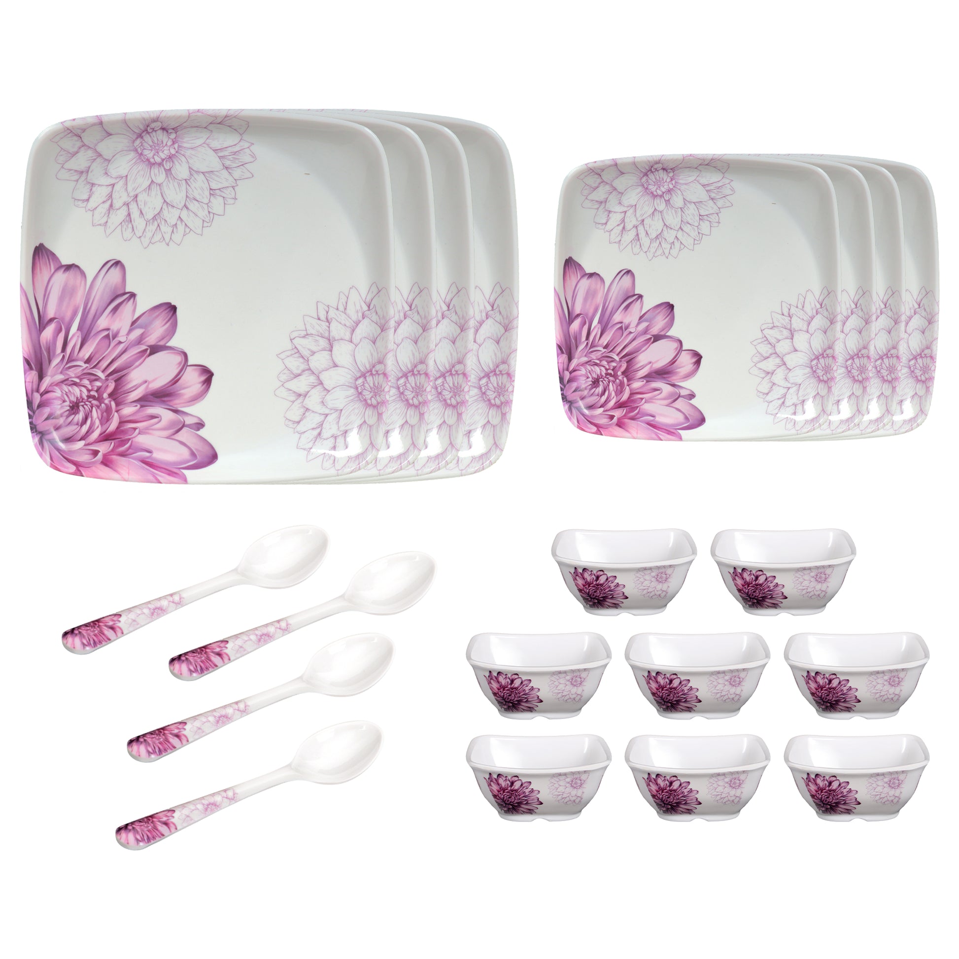 Pack of 20: Melamine Dinner Set with Floral Design | Serves 4 | Pink & White