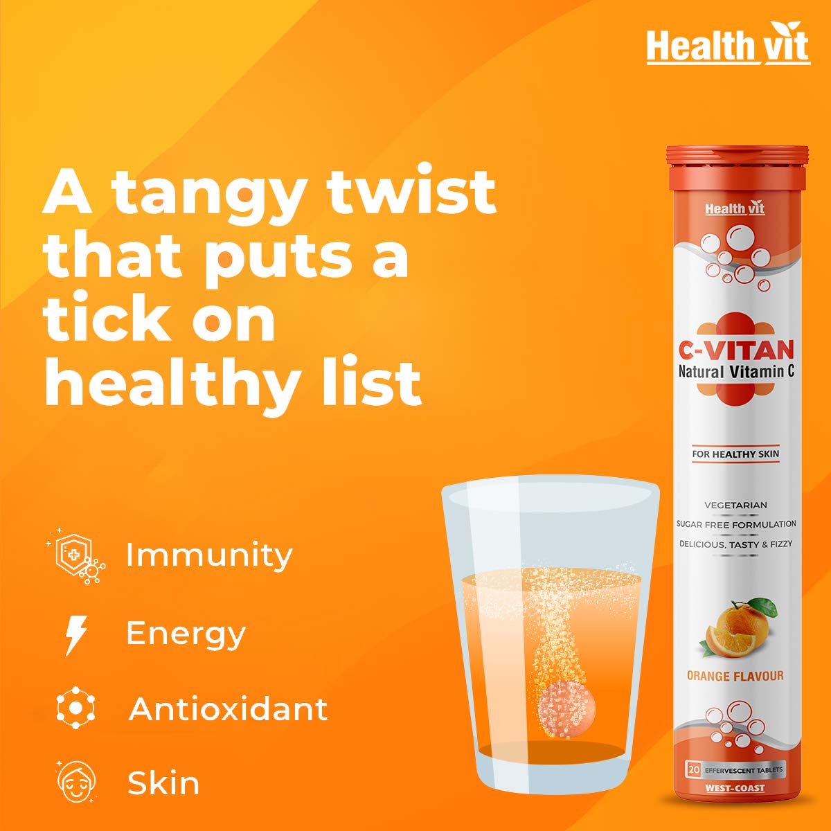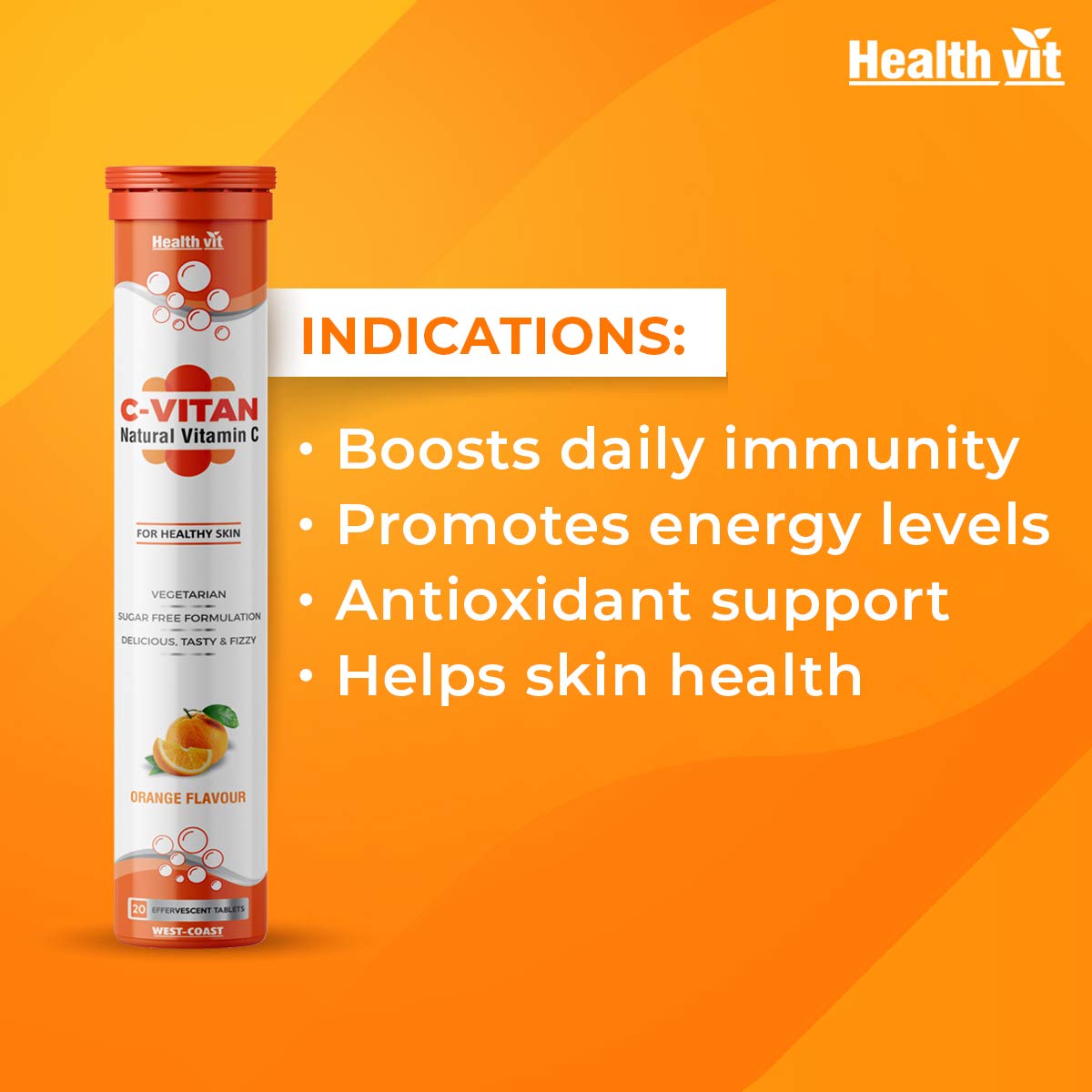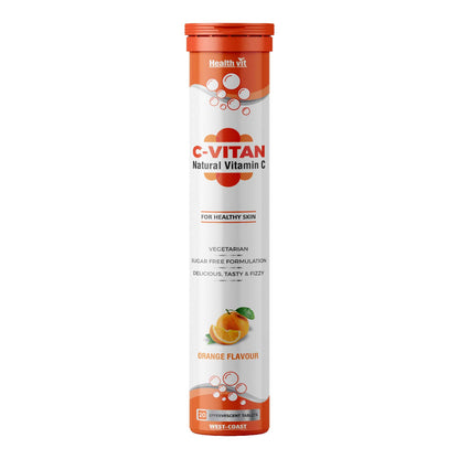 Healthvit C- Vitan N Natural Vitamin C For Antioxidant Support | Improves Immunity And Skin Health | Delicious, Tasty & Fizzy | Sugar Free 20 Effervescent Tablets (Orange Flavor)