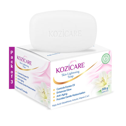 Introducing the Kozicare Kojic Acid Soap & Glutathione Soap by Kozicare, your ultimate solution for achieving glowing, youthful skin. This luxurious body tan removal soap comes in a convenient pack of 3 and each 75g bar is enriched with a powerful blend of 0.50% kojic acid, 0.50% arbutin, 0.50% vitamin C, 0.50% vitamin E, and 0.30% glutathione. Perfect for daily use, this soap combo aids in effectively removing dark spots and hyperpigmentation while deeply nourishing and moisturizing your skin.