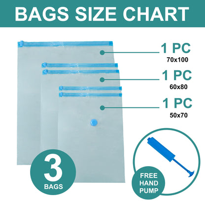 Kuber Industries Set of 3 Vacuum Bags for Storage with Pump | Spacesaver Vaccine Bags for Clothes & Pillows | Sealed Compression Bags for Travel with Hand Air Pump | YLN001 - Blue & Transparent