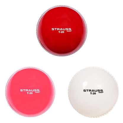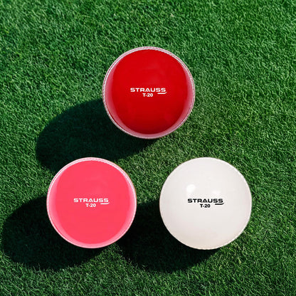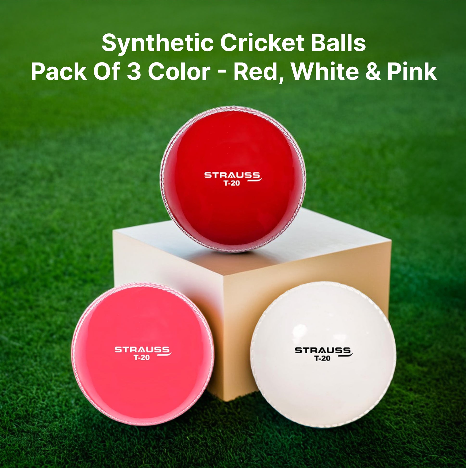 STRAUSS Synthetic Cricket Balls | Model: T-20 | Standard Size | Pack of 3 Color: Red, White and Pink | for Matches & Practice | for All Age Groups | Midweight T-20 Ball