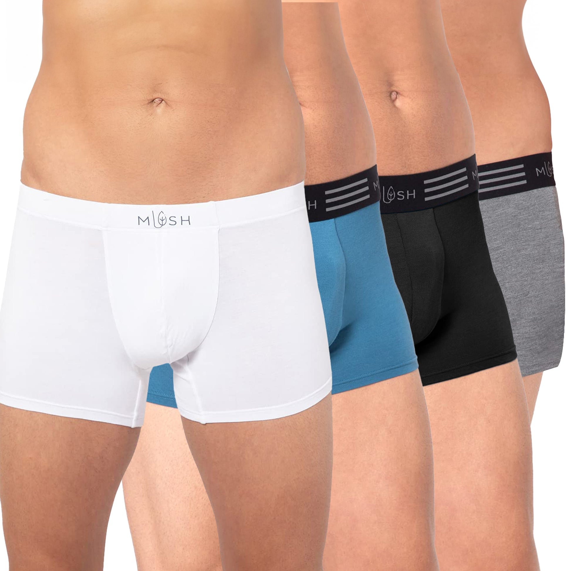 Introducing the Mush Bamboo Underwear for Men, your ultimate choice for comfort and style. This pack of 4 trunks features 95% Bamboo and 5% Spandex materials, designed specifically for the modern man. Available in sizes small, this pack includes classic colors: White, Blue, Black, and Melange Grey. Experience the luxury of a soft, lightweight, and breathable fabric that keeps you comfortable all day long.