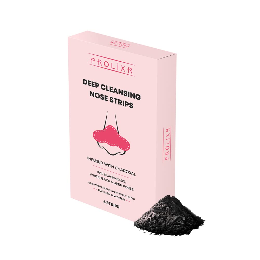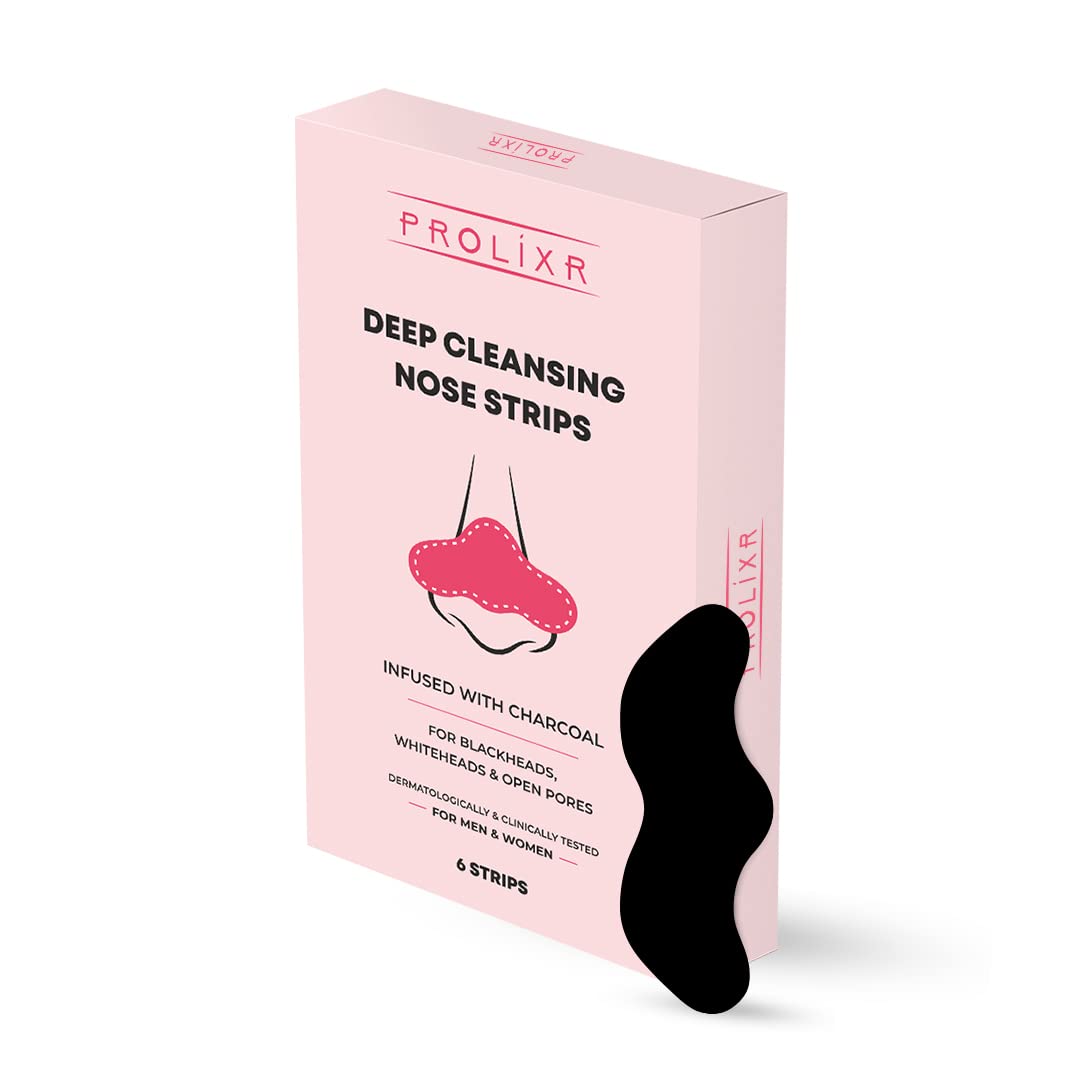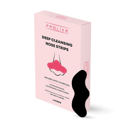 Introducing the 6 Strips Prolixr Deep Cleansing Charcoal Nose Strips, your solution to banish blackheads and whiteheads. Each strip is infused with activated charcoal, witch hazel extract, and tea tree oil, ensuring effective unclogging of pores. These nose strips are designed to provide a painless and efficient way to reveal smoother, cleaner skin.