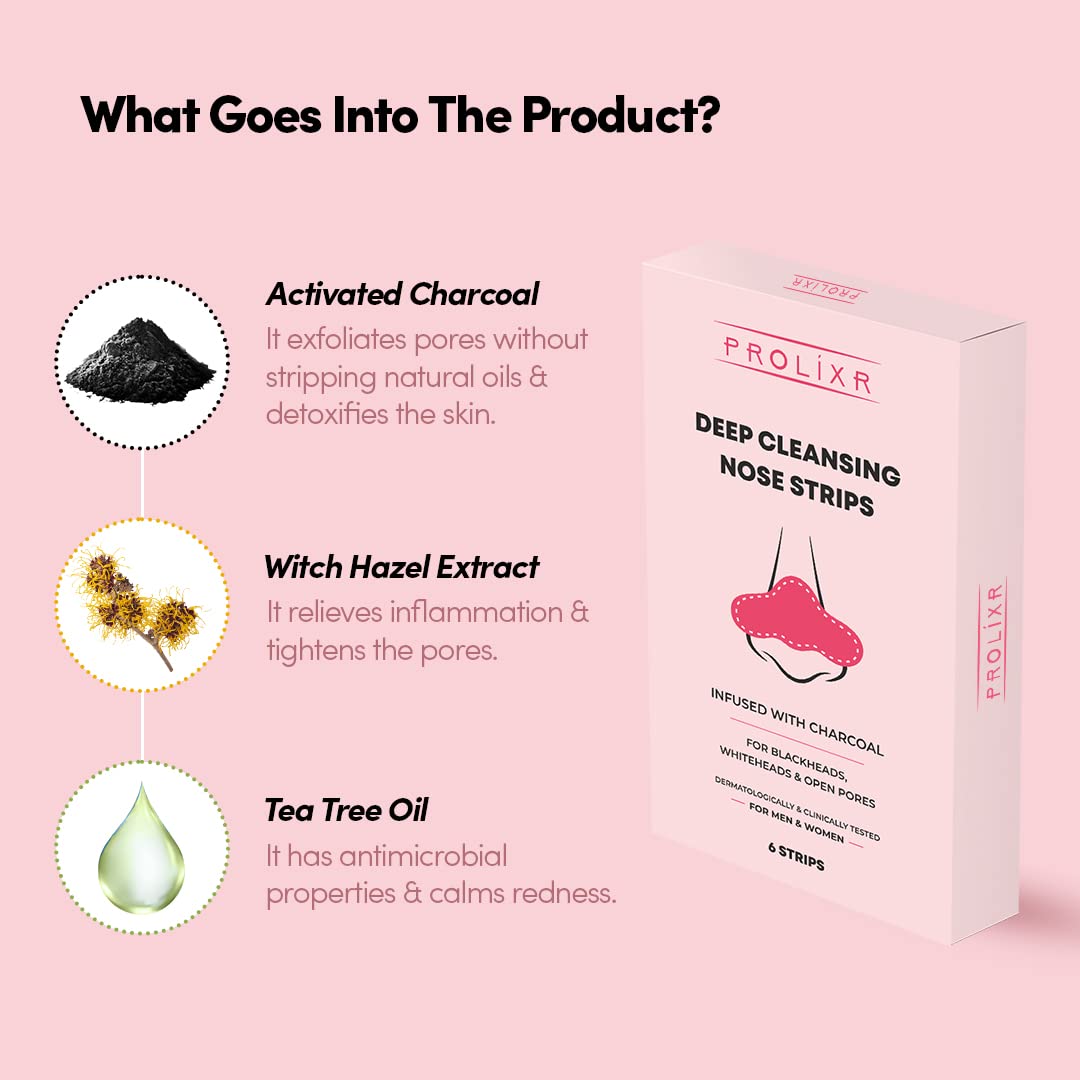 Prolixr Deep Cleansing Charcoal Nose Strips | With Witch Hazel & Tea Tree Extracts | Removes Blackheads & Whiteheads | Unclog Open Pores - For Women & Men - 6 Strips