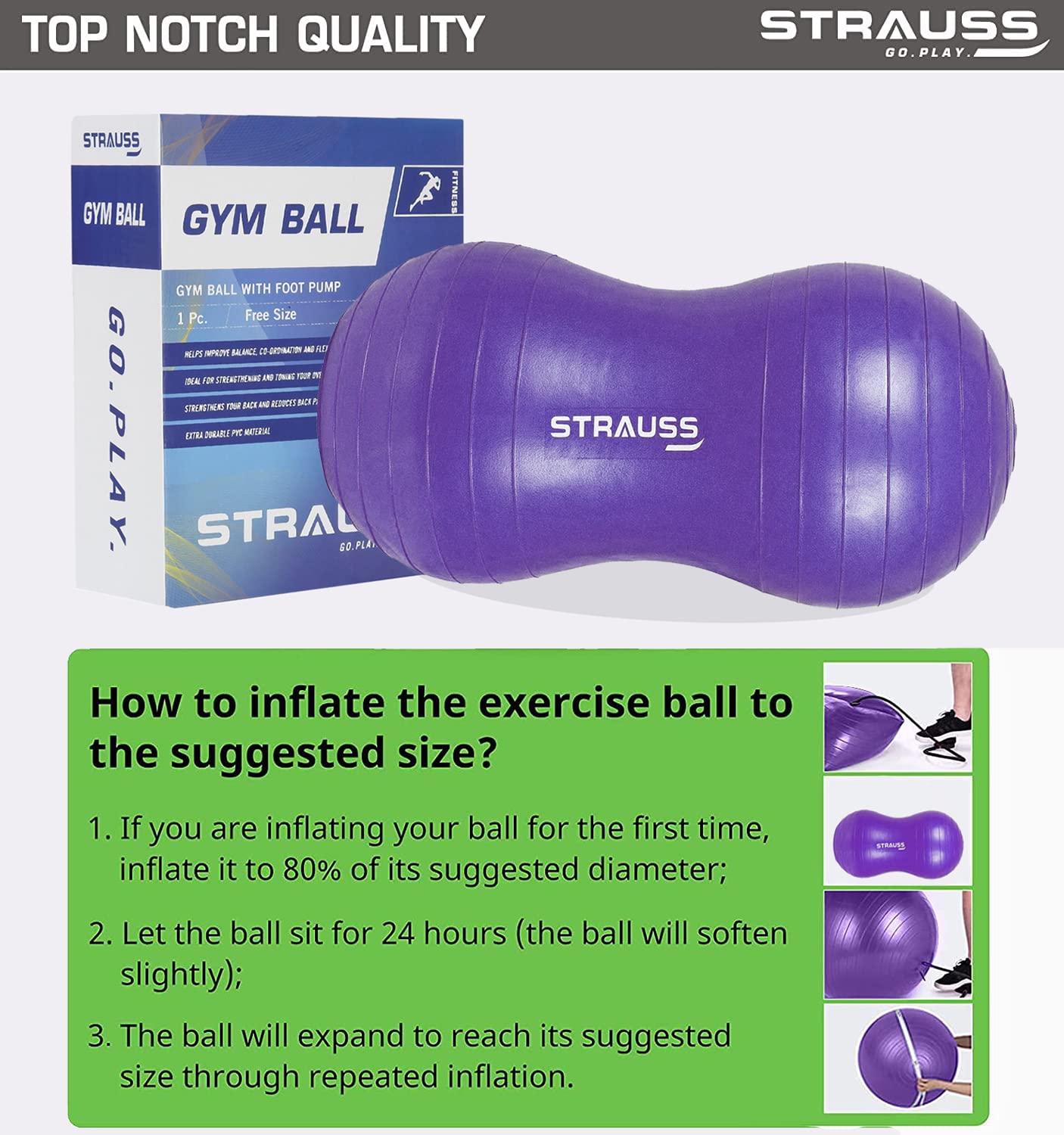 Introducing the STRAUSS Rubber Anti-Burst Gym Ball, Peanut Shape, your perfect partner for a variety of exercises. This versatile gym ball is designed to enhance your workout experience while ensuring maximum safety. Measuring 95x45 cm and featuring an attractive purple color, this gym ball is constructed from durable rubber materials and includes a convenient foot pump for easy inflation.