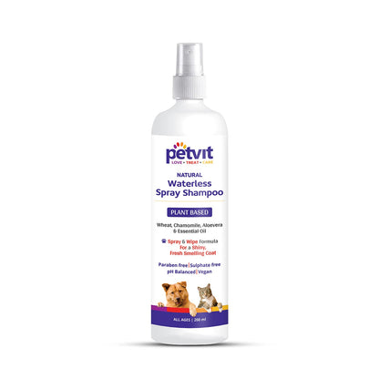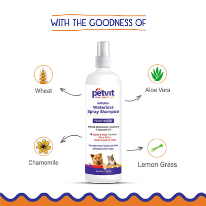 Petvit Plant Based Natural Waterless Spray Shampoo with Wheat Protein, Lemongrass Oil, Lavender, Rosemary, Eucalyptus, Coconut Oil, Castor Oil All Breed Dog & Cat - 200ml