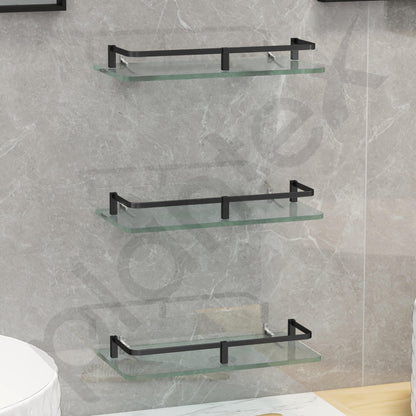 Bathroom Accessories - Wall Mounted Bathroom Shelf/Glass Shelves for Kitchen/Living Room with Black Brass Railings (Frosted - 12x6 Inches - Pack of 3)