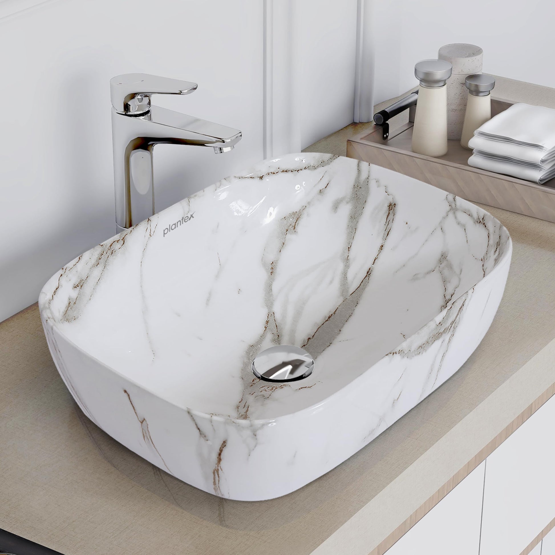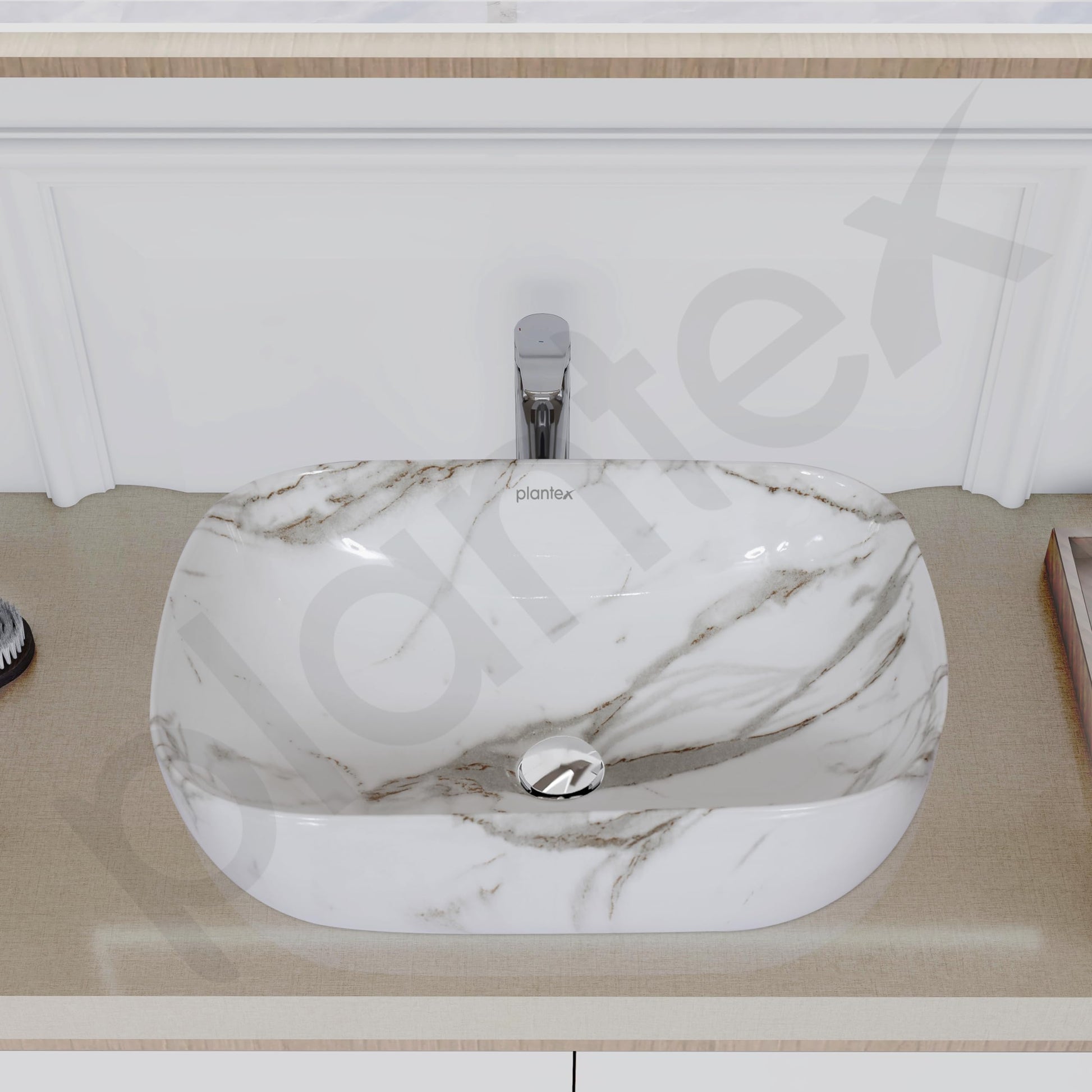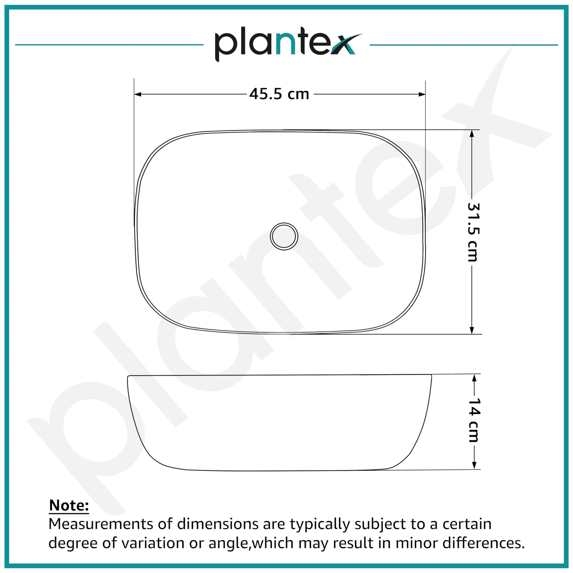 Introducing the Plantex Ceramic Basin for Bathroom/Table Top Ceramic Basin with Glossy Marble Finish. This elegantly designed wash basin measures 45.5 x 32.5 x 14 cm and is made from high-quality ceramic. Ideal for modern and stylish bathrooms, it offers both durability and aesthetic appeal. With one unit included in the package, this basin is perfect for a variety of applications in your home.