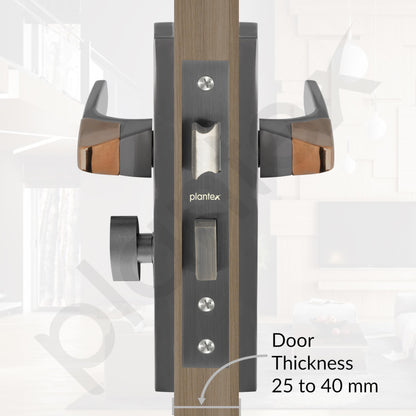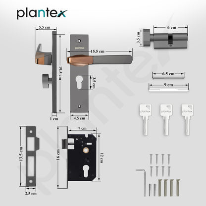 Introducing the Plantex Heavy-Duty Mortise Door Lock Set (Model: APS-8114), featuring a robust 6-Lever Lock Mechanism designed for superior security. This set includes 2 stylish handles, a durable brass lock body and cylinder, and 3 computerized brass keys. Crafted from high-quality Zinc Alloy and Brass, with a sleek Satin Black & PVD Choco finish, this lock is both functional and aesthetically pleasing for any home or office.