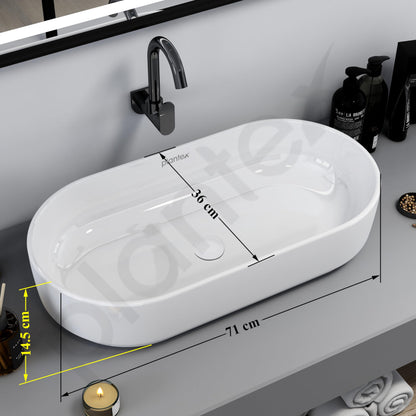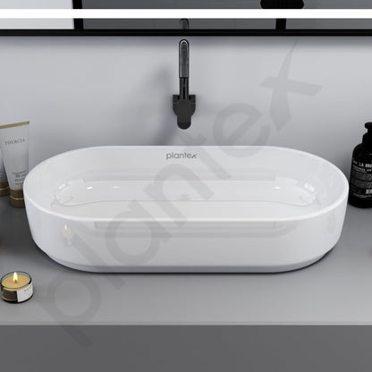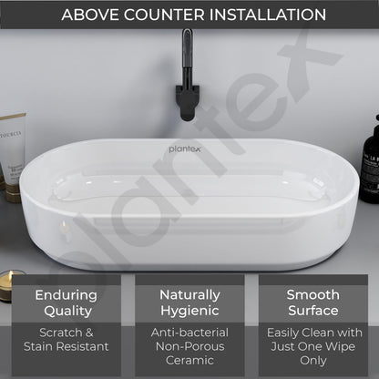 Introducing the Plantex Platinium Ceramic Tabletop Oval Wash Basin by Plantex. This elegant and modern wash basin, made from high-quality ceramic, measures 28 x 14.5 x 6 inches. Designed for countertop installation, it provides both function and style for your bathroom. With its glossy white finish, this basin enhances the overall aesthetics of any bathroom while being extremely easy to install and maintain. The product comes as a single unit, ensuring you receive the complete package for upgrading your wash space.
