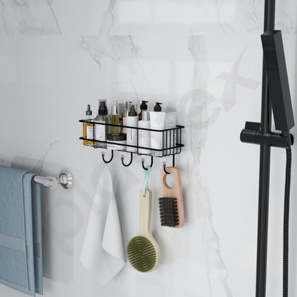 GI Steel Self-Adhesive Multipurpose Bathroom Shelf with Hooks/Towel Holder/Rack/Bathroom Accessories-Wall Mount - Pack of 1 (Black,Powder Coated)
