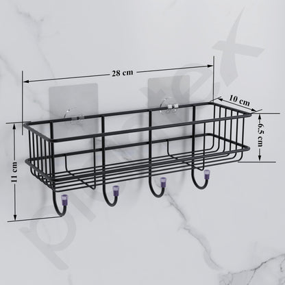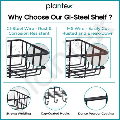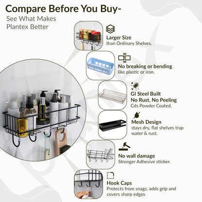 Plantex GI Steel Self-Adhesive Multipurpose Bathroom Shelf with Hooks/Towel Holder/Rack/Bathroom Accessories-Wall Mount - Pack of 1 (Black,Powder Coated)