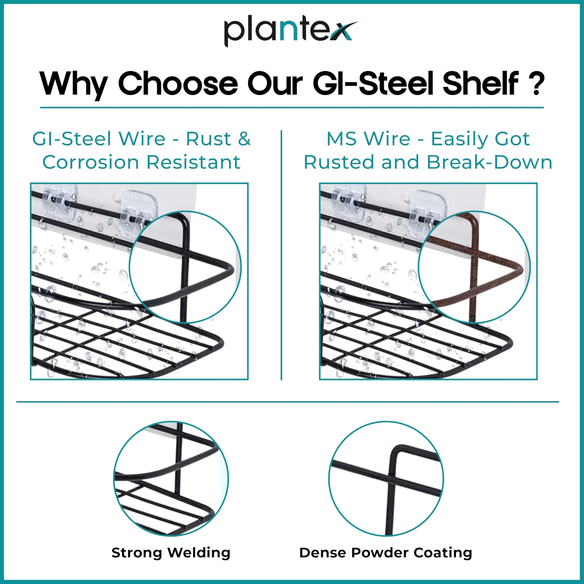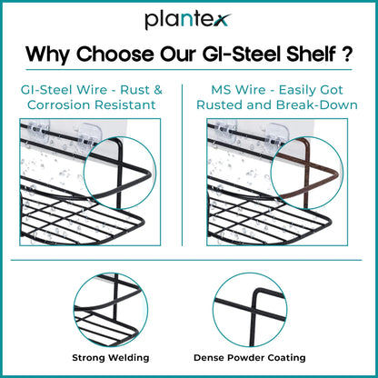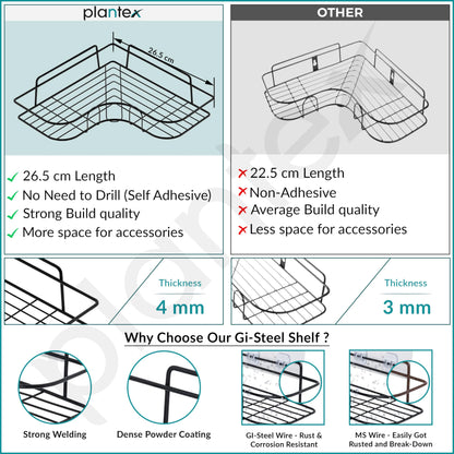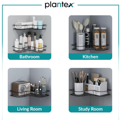 Plantex Self Adhesive Corner Shelf for Bathroom/Adhesive Shelf for Kitchen with Magic Sticker/Bathroom Organizer Without Drill (GI Metal, Black) - Pack of 2