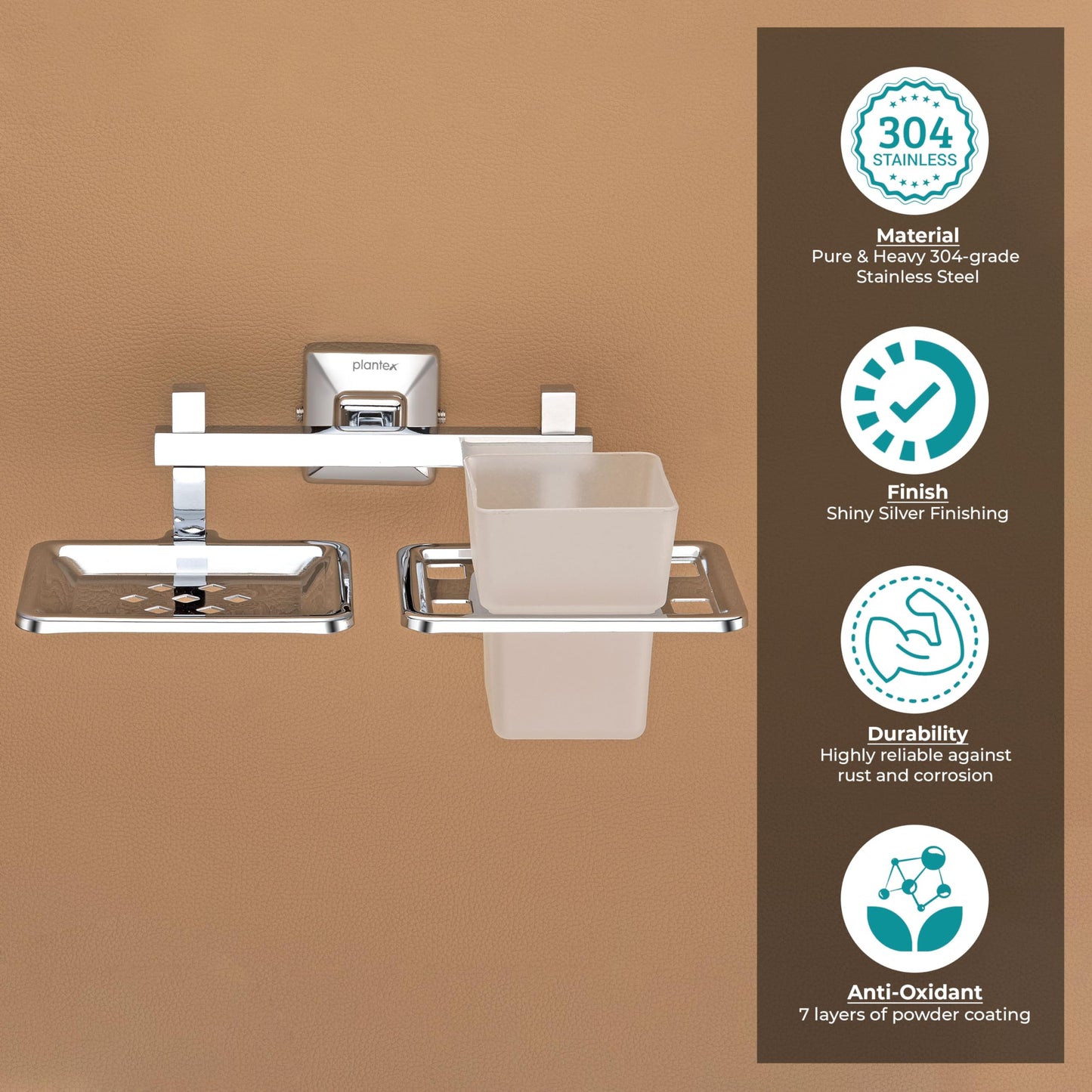 Elevate your bathroom organization with the Plantex Stainless Steel 304 Grade Squaro 2in1 Soap Holder with Tumbler Holder. This innovative accessory combines style and functionality, making it an essential addition to any modern home.