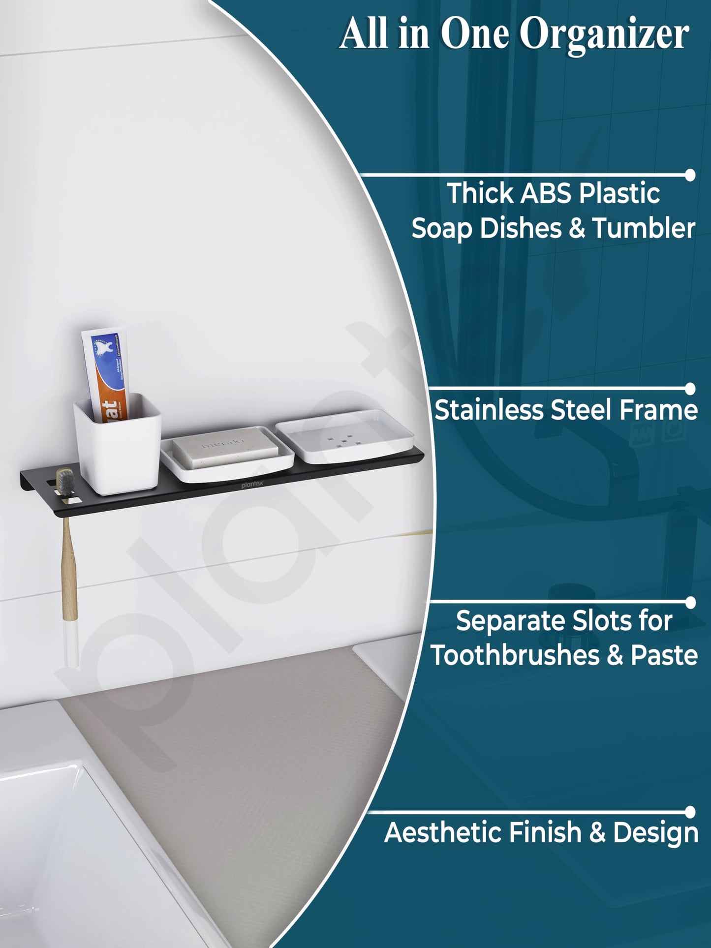 Plantex Stainless Steel with ABS Material Double Soap Dish/Stand with Tumbler Holder for Bathroom/Kitchen/Paste&Brush Stand/Bathroom Accessories-Matt Black