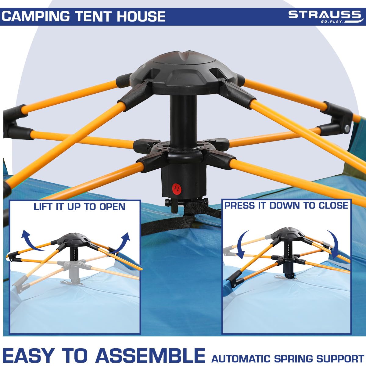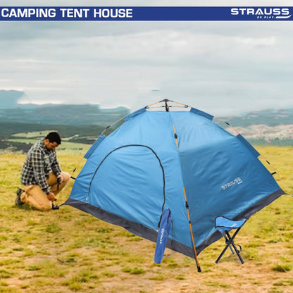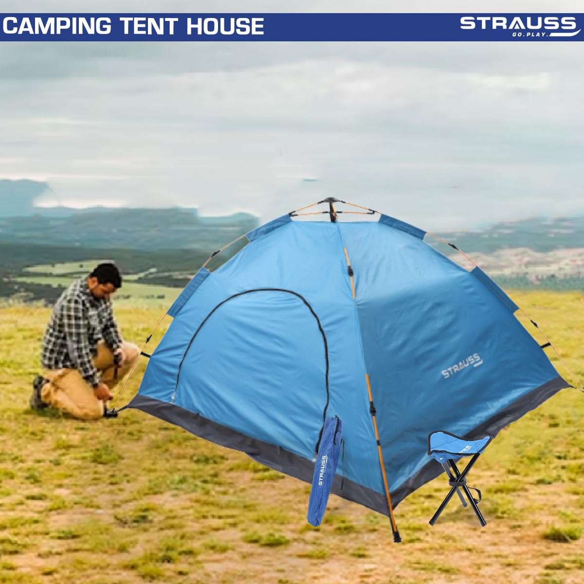 STRAUSS Portable Tent for Camping | Ideal for 4 Persons | 5-10 Minutes Easy Setup for Picnic, Hiking, Trekking | Waterproof and Windproof Tent for Travel | Superior Air Ventilation (Blue)