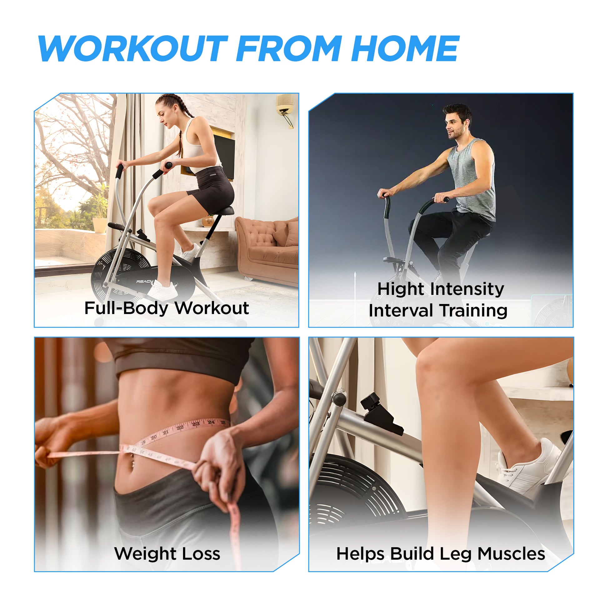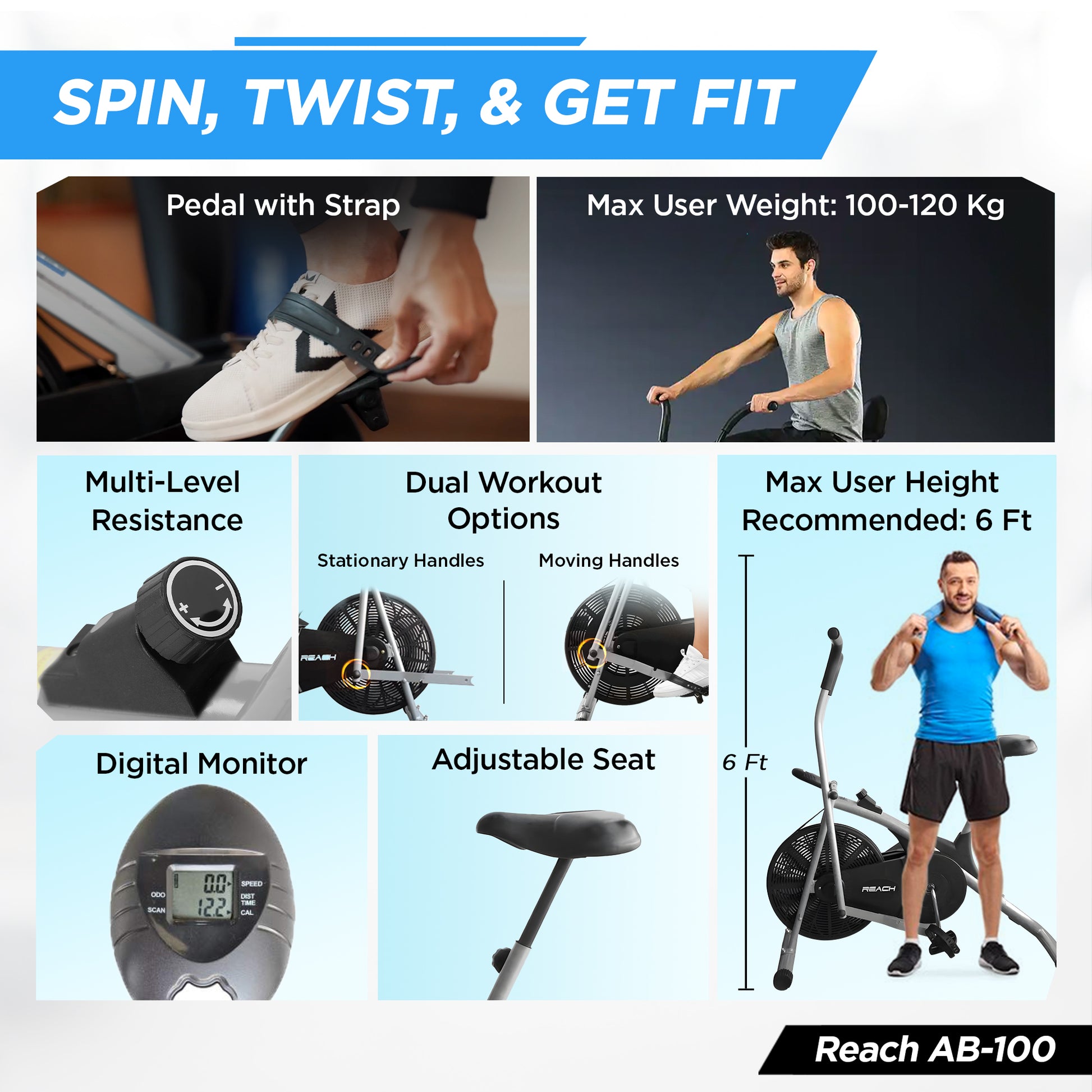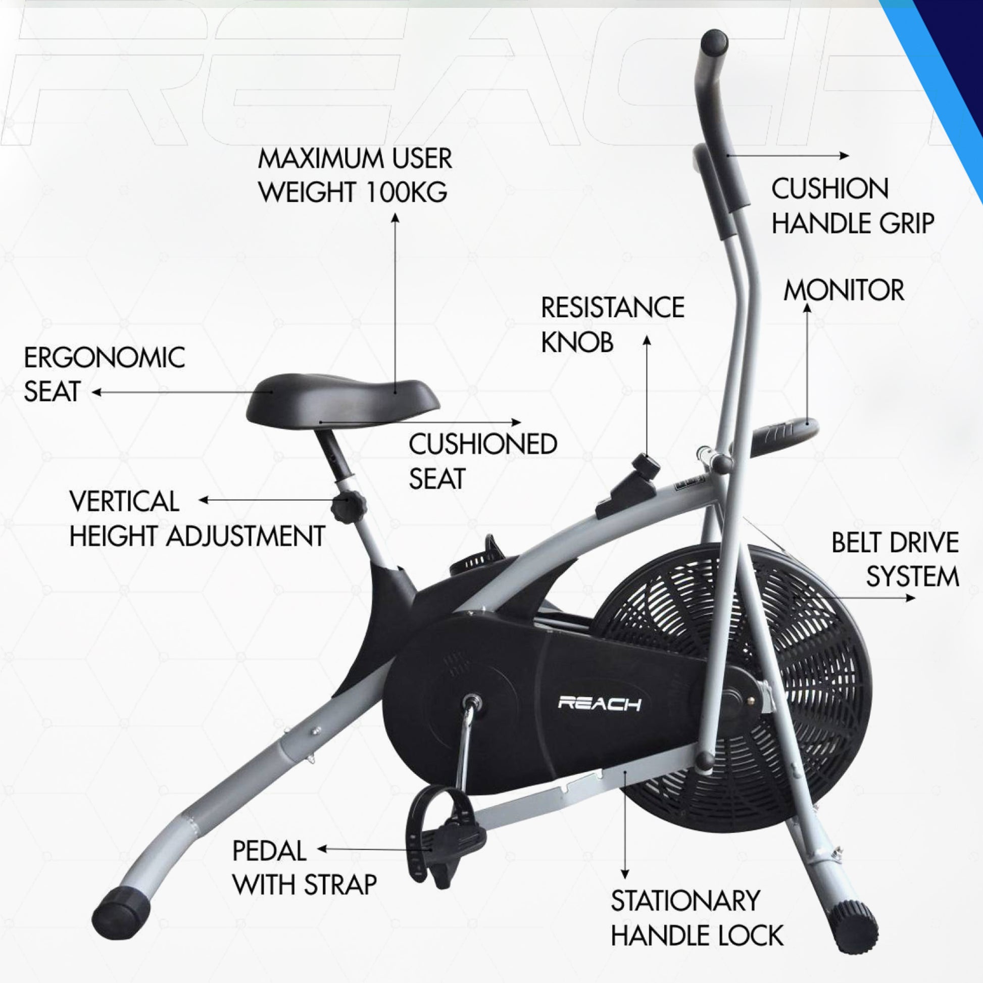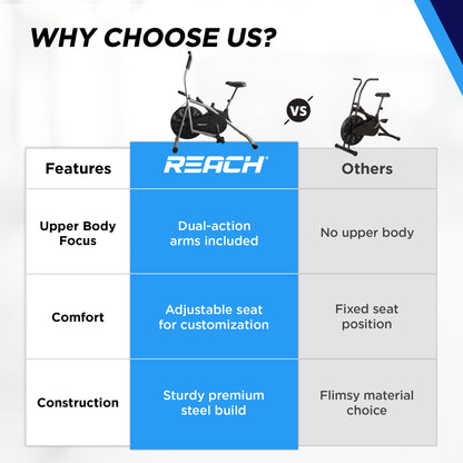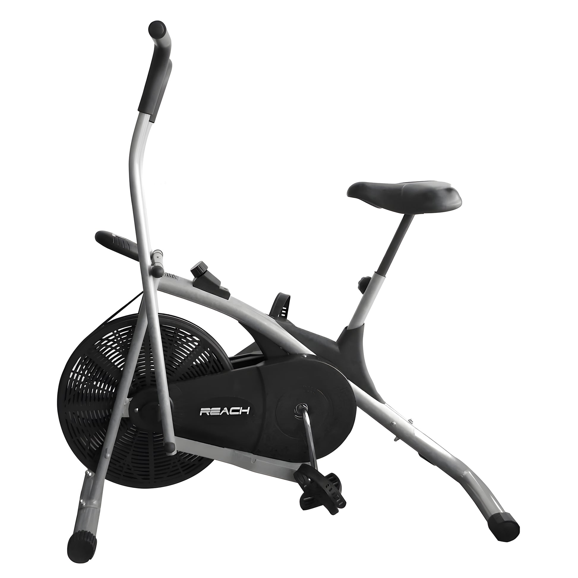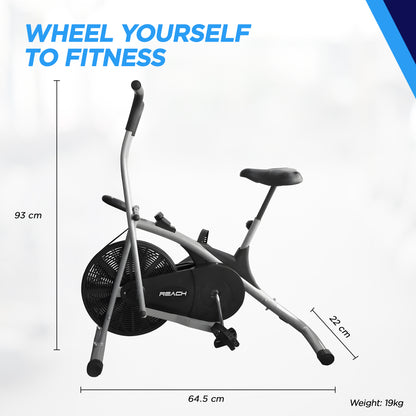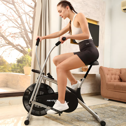 Reach AB 100 Upright Air Bike with Moving/ Stationary Handle | Exercise Fitness Cycle | Adjustable Resistance Cushioned Seat | Max User Wt. 110 Kg | Cardio Equipment Machine | Home Gym Workout | Grey
