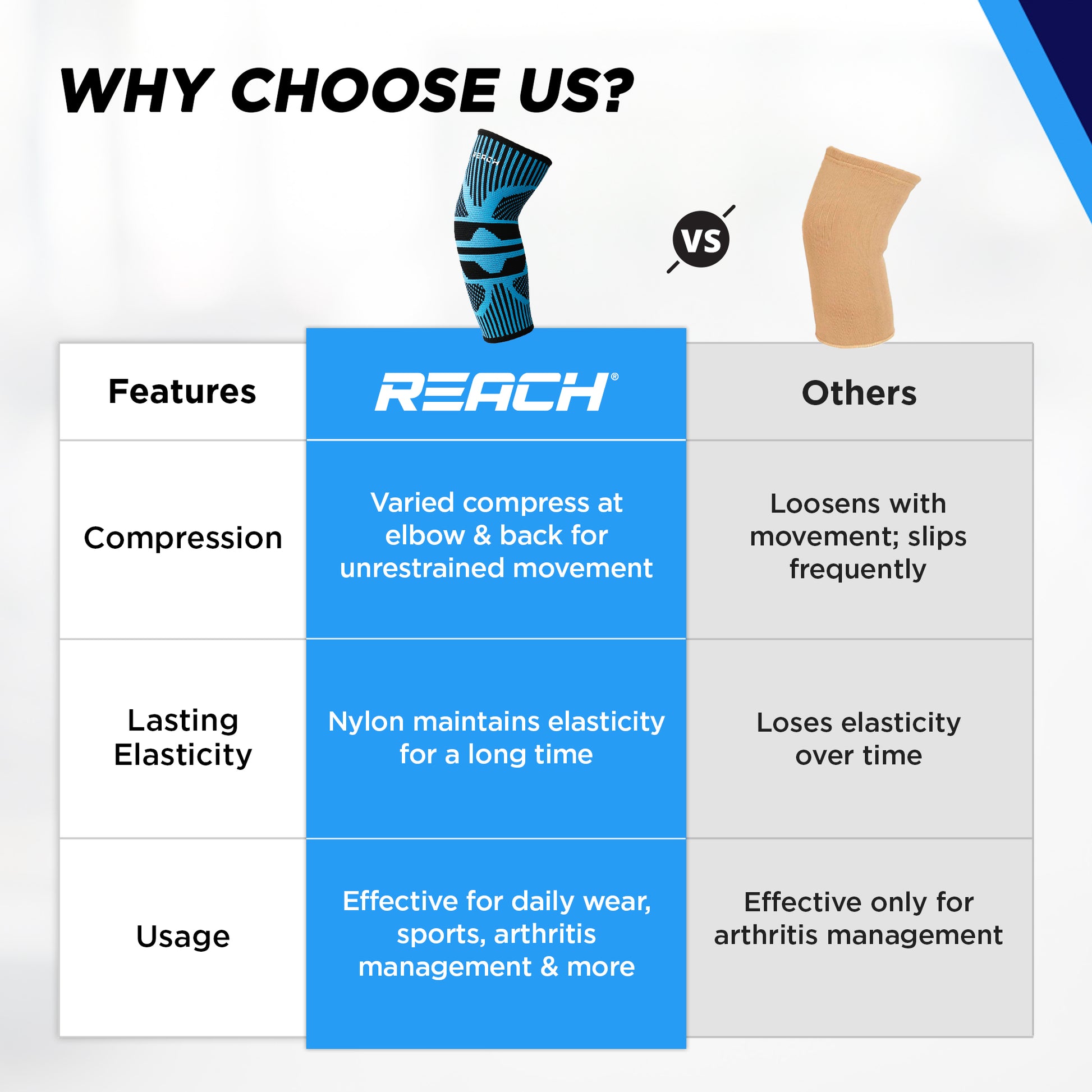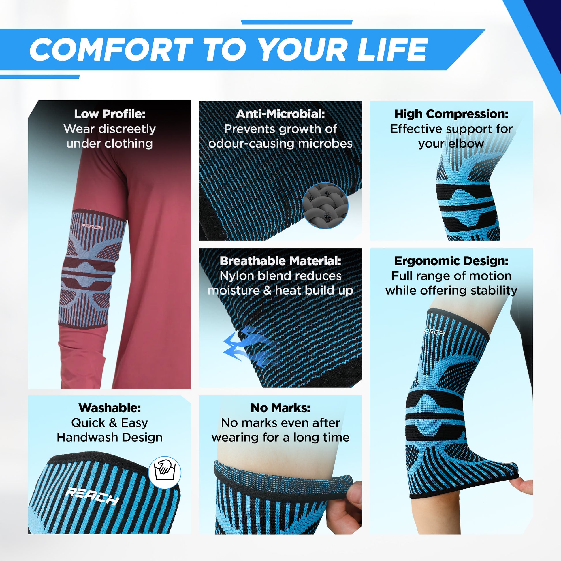 REACH Elbow Support for Gym | Elbow Band for Pain Relief | Nylon Material | Tennis Elbow Band for Men & Women | Elbow Guard Cricket, Badminton & Sports | Compression Technology & No Marks | Blue-Small