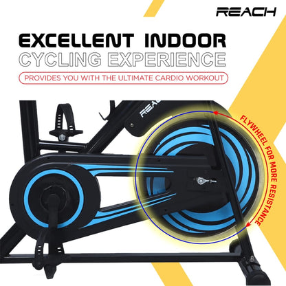 Introducing the Reach Vision MII PT Spin Bike, designed for a smooth and effective workout experience. This spin bike comes with a robust 6.5 Kg Flywheel, perfect for maintaining momentum and stability. Its heavy-duty steel frame supports users up to 110 kg. The LCD monitor tracks your time, speed, distance, and calories burned, helping you achieve your fitness goals efficiently. The spin bike is a standout in its category, paired with a pushup bar and twister for varied training.