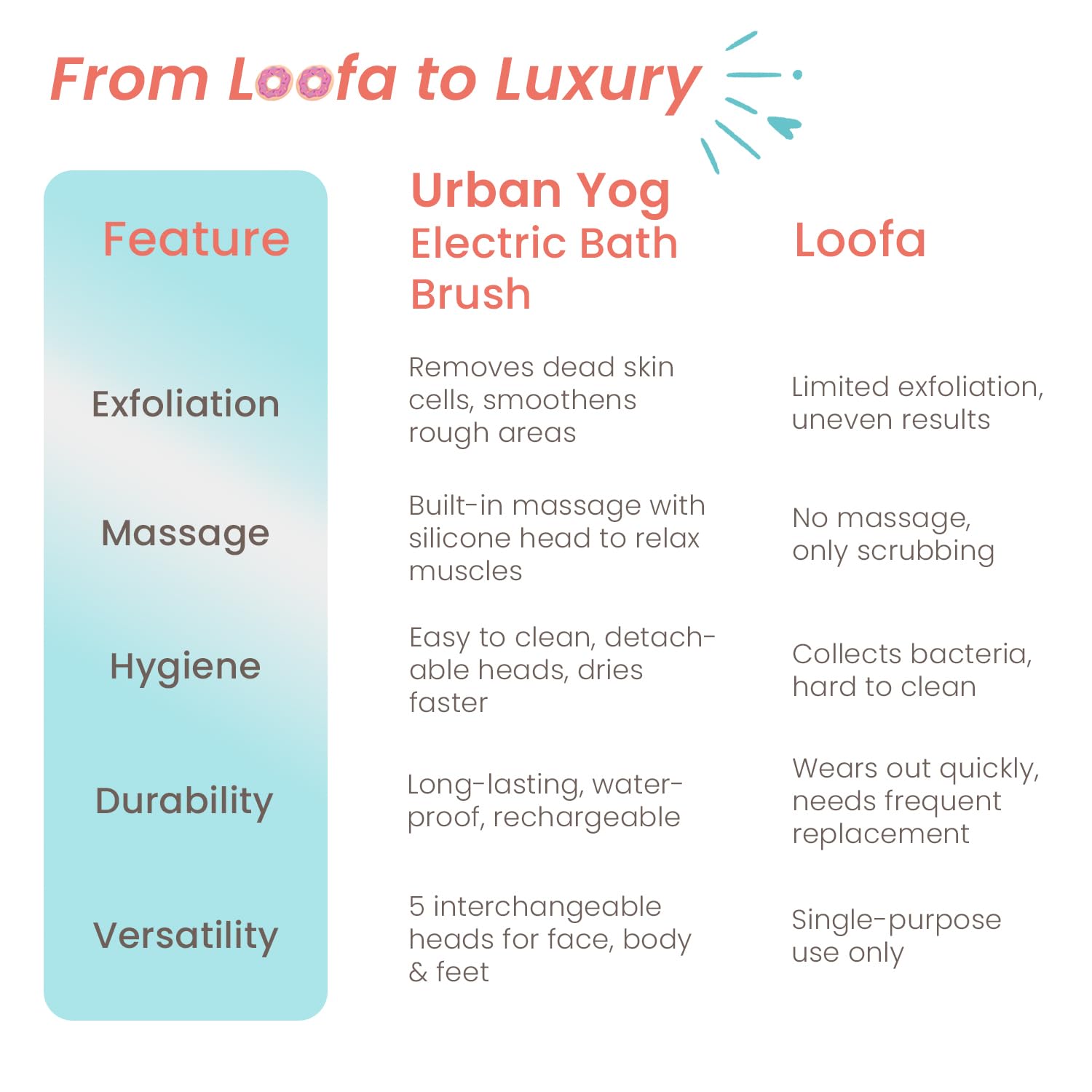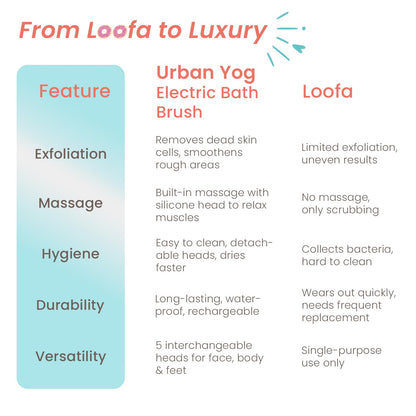 Perfect for any bathroom routine, the Urban Yog Bath Brush ensures you can reach every part of your body with its innovative dual handle design and IPX7 waterproof technology, making it suitable for both bath and shower use. With a magnetic USB charger, your brush is not only convenient to use but also incredibly easy to maintain, allowing you to enjoy a world of luxury without the fuss of traditional loofahs.