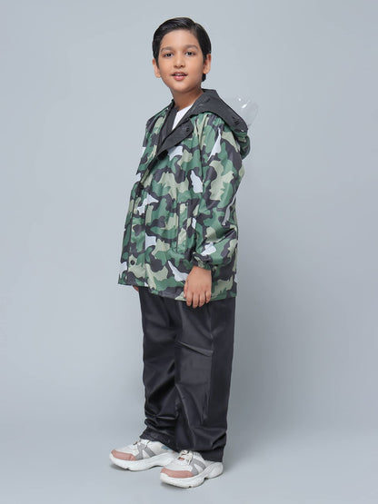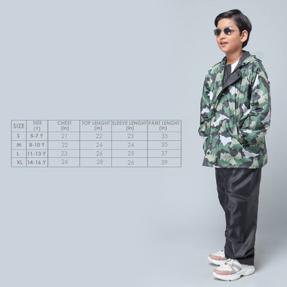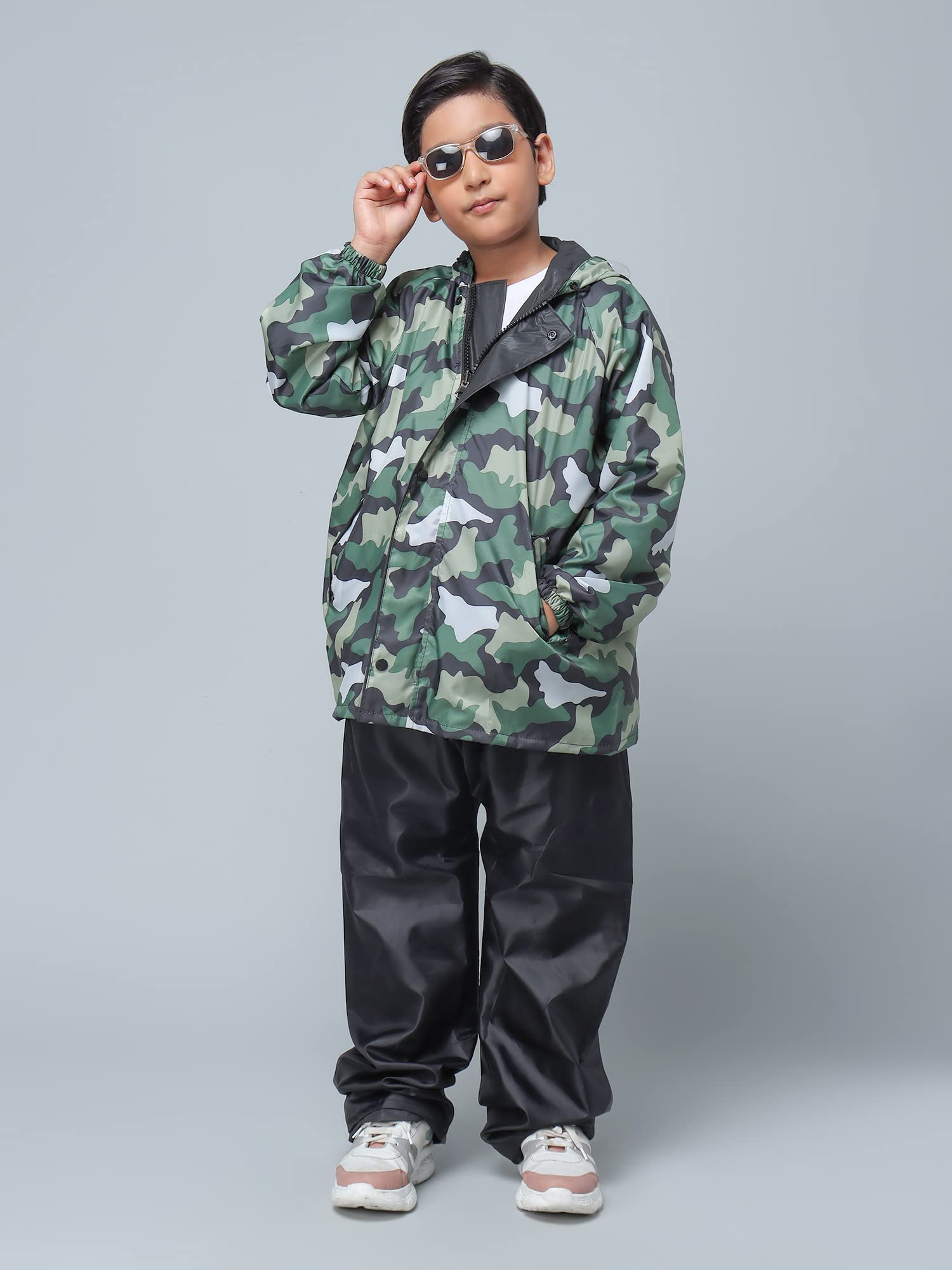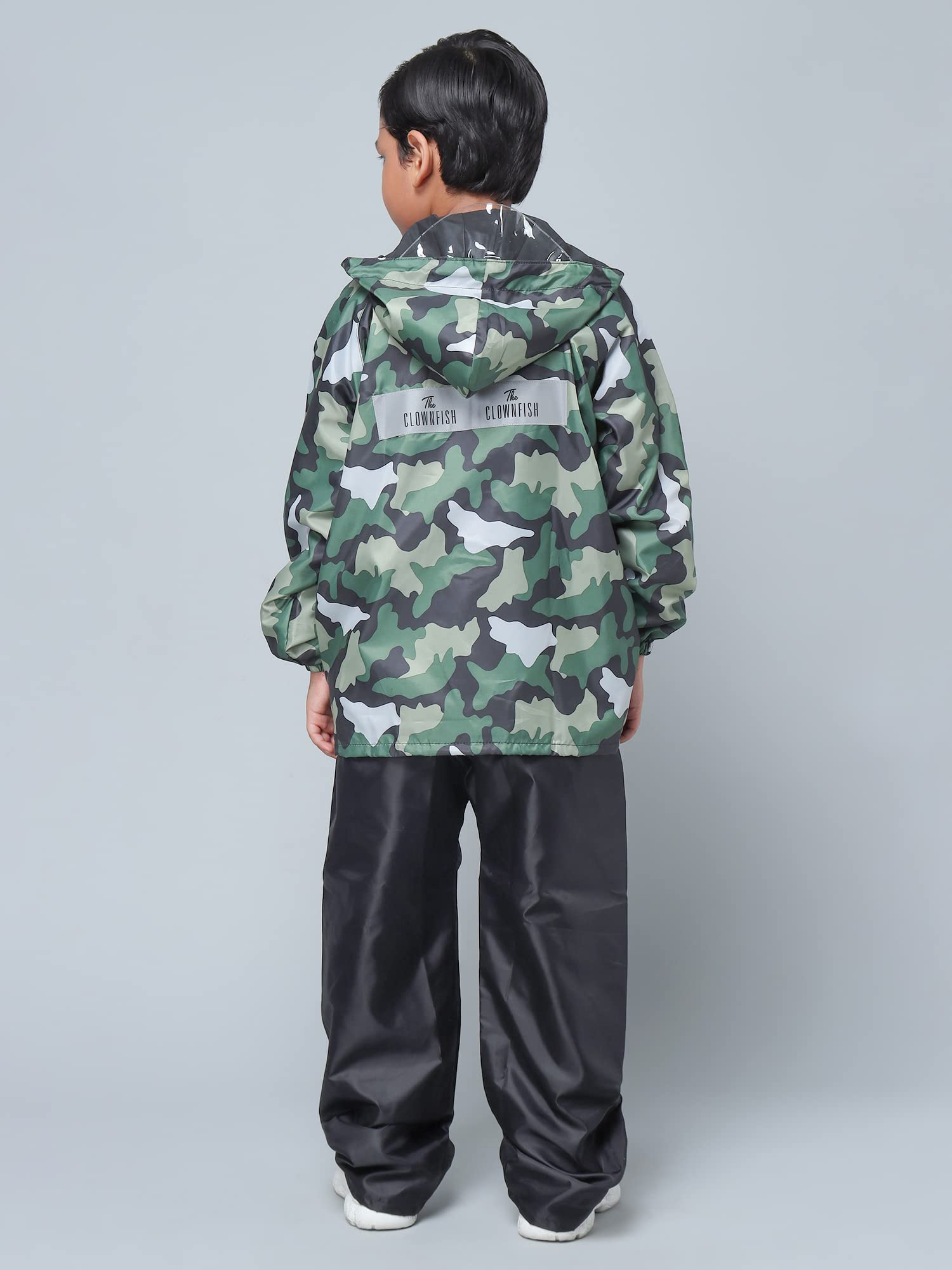 THE CLOWNFISH Comrad Series Kid's Waterproof Nylon Double Coating Reversible Standard Length Raincoat With Hood & Reflector Logo At Back, Top & Bottom Printed Plastic Pouch, 11-13 Years (Green Camo)