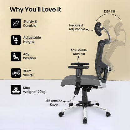 Introducing the SAVYA HOME Beatle High Back Ergonomic Office Chair, your ideal companion for both home and office work. This chair is designed with a sleek gray solid pattern and crafted from durable alloy steel, ensuring that it not only looks great but also provides the utmost comfort during long hours of use. Equipped with adjustable arms, a headrest, and a specialized 2D lumbar support system, it’s perfect for any workspace.