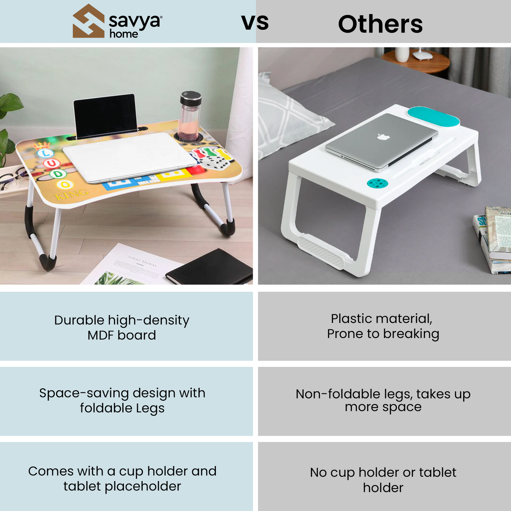 SAVYA HOME Multi-Purpose Portable Laptop Table, Foldable Wooden Desk For Bed Tray, Laptop Table, Study Table With Mug Holder, Ergonomic, Non-Slip Legs, Breakfast In Bed Table, Ludo, 28 Centimeters