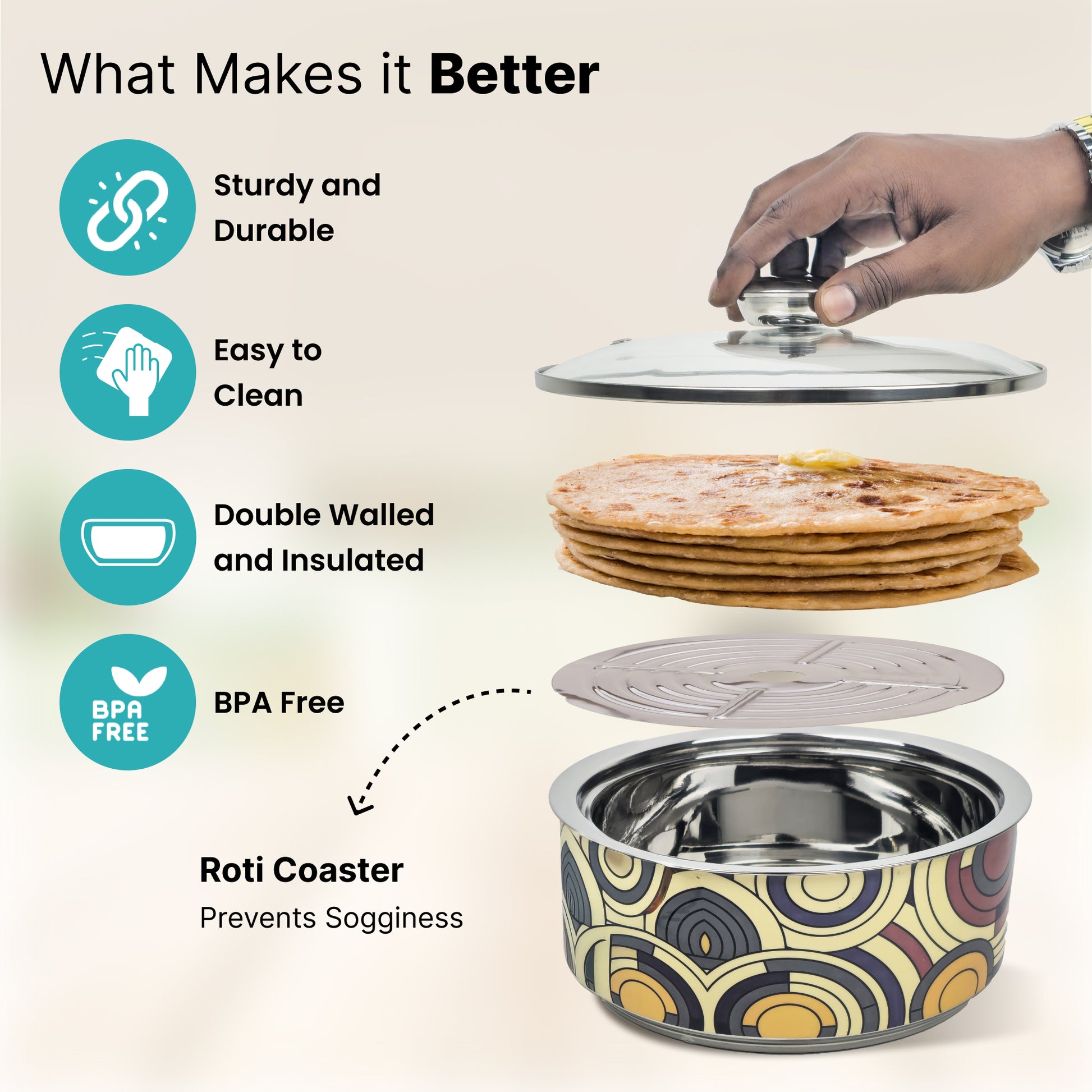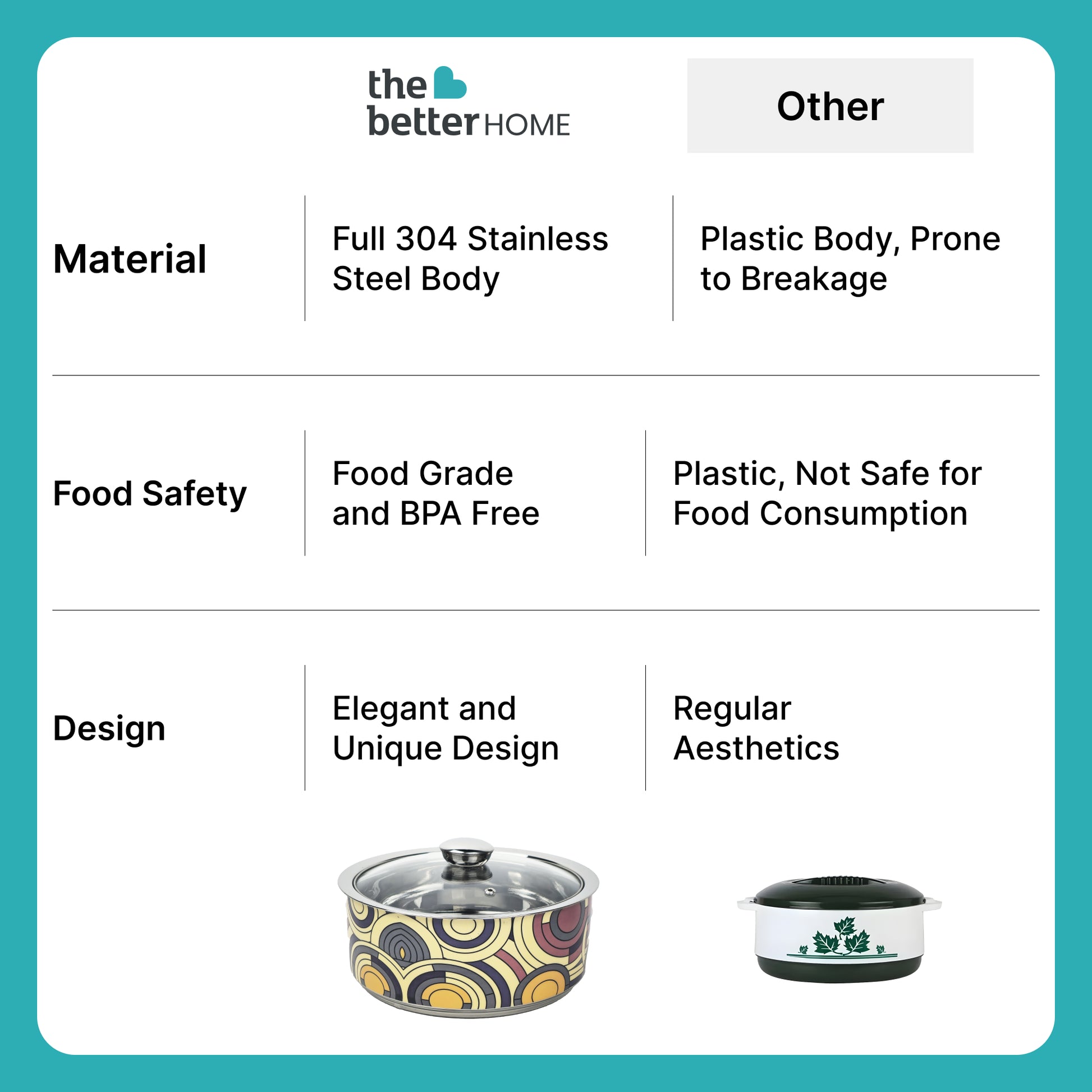 • Heat Retention: Insulated to keep meals warm longer and beautifully display dishes.