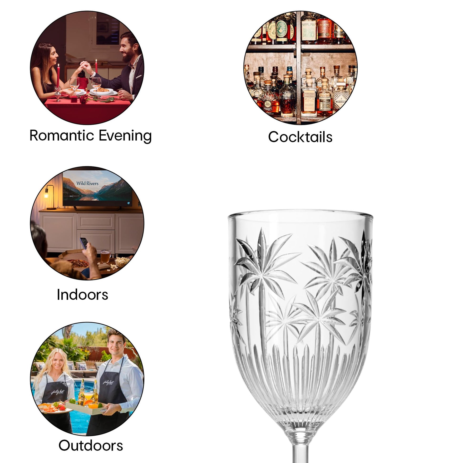 Introducing the Anko Acrylic Wine Glasses - Set of 4. These elegant palm design tumblers are crafted from high-quality acrylic, featuring a generous capacity of 410ml each, making them perfect for any occasion. Their clear finish and sleek stem not only enhance the aesthetic but also ensure durability and lightweight handling, ideal for both indoor and outdoor enjoyment.
